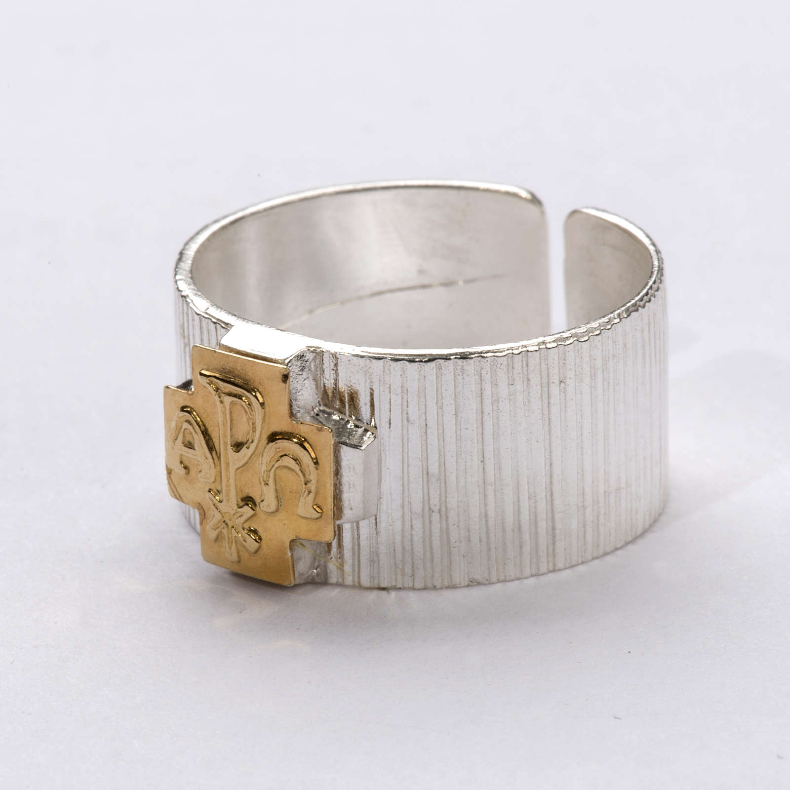 Bischofsring Silber Alpha Omega und Chi-Rho. Der Ring ist aus Silber 925 realisiert, und mit einem Kreuz mit den Symbole Alpha und Omega und Chi-Rho aus goldenen Sylber dekoriert.