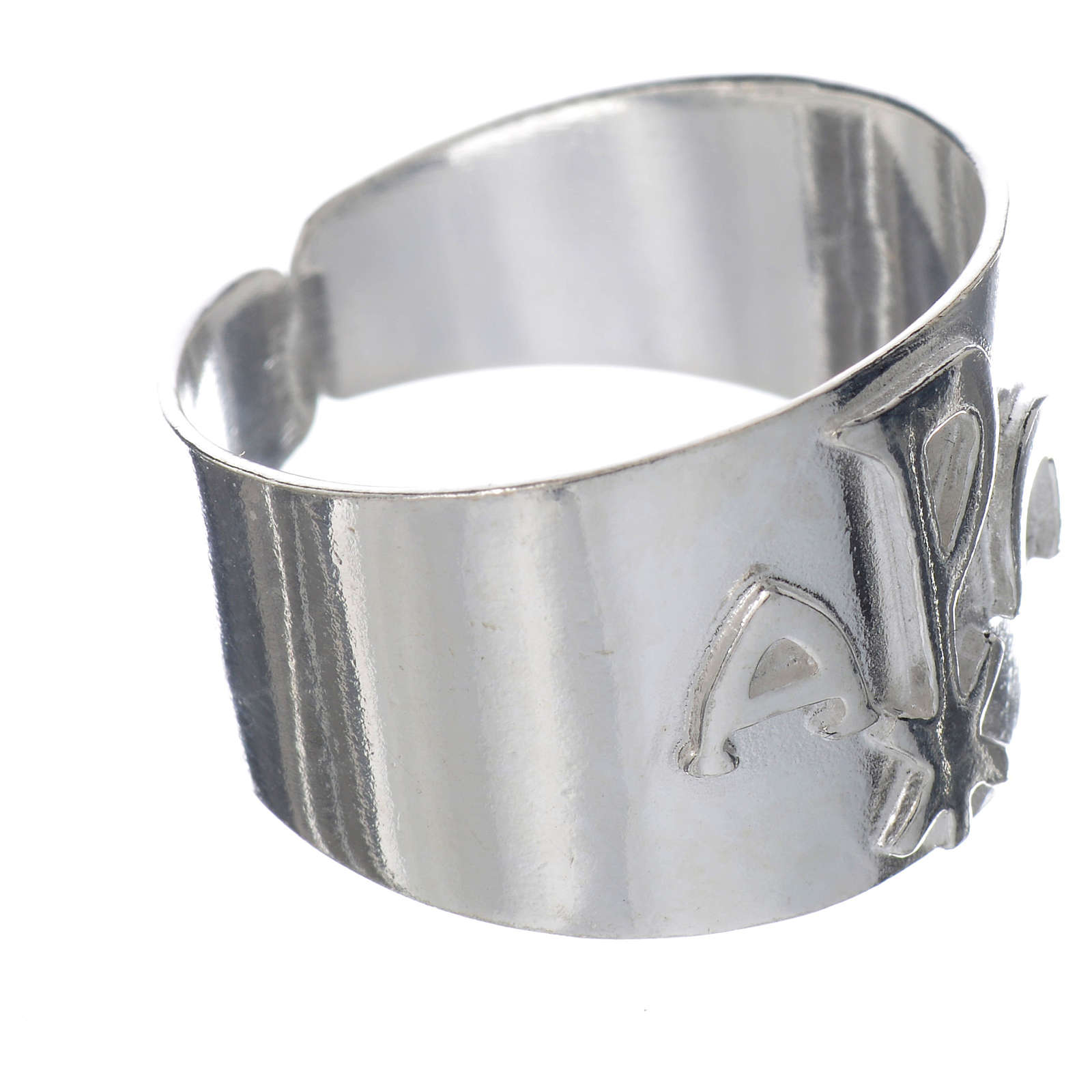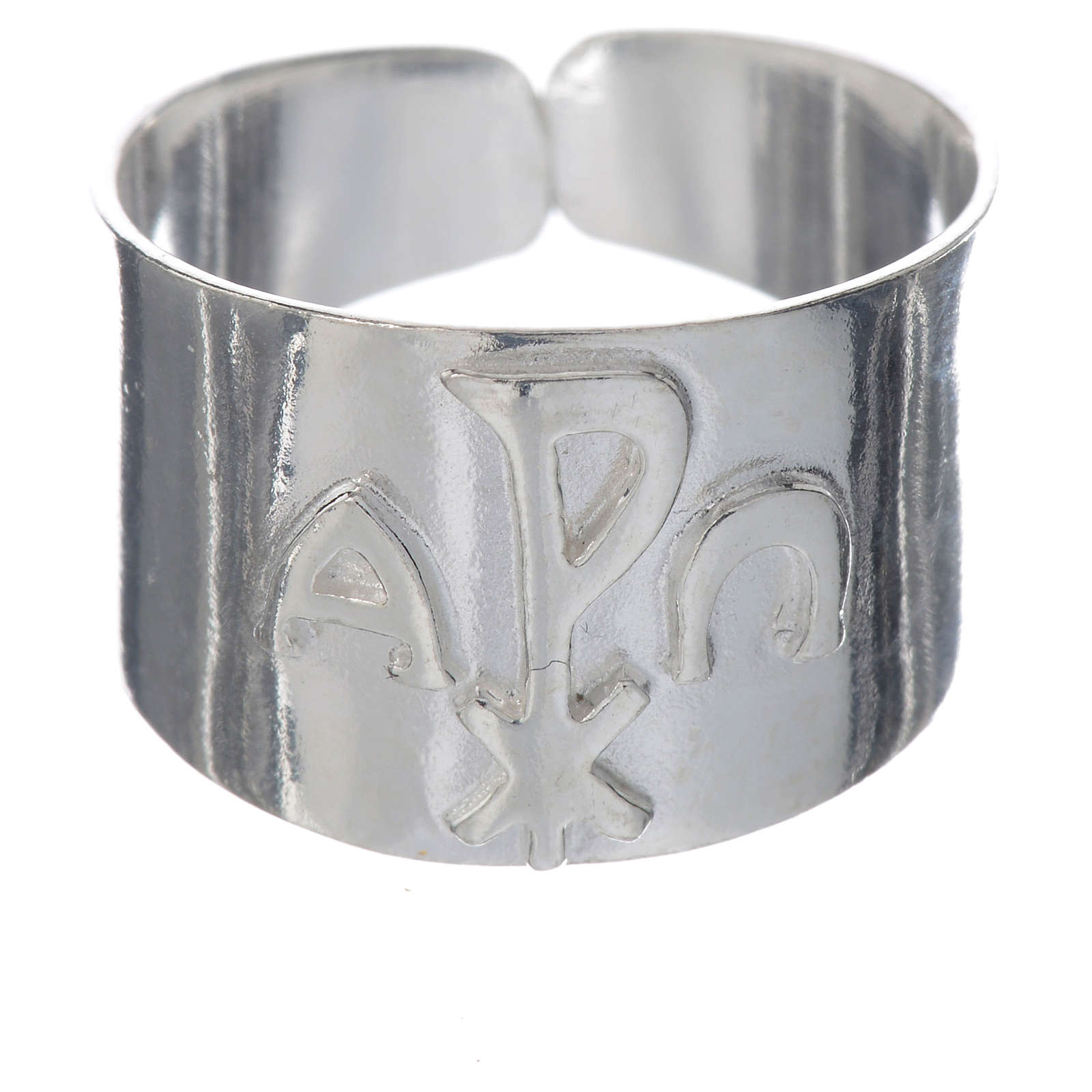 Bischofsring XP und Alpha und Omega Silber. Der Ring ist aus Silber realisiert und ist mit Chi-Rho und Alpha und Omega Symbolen dekoriert.