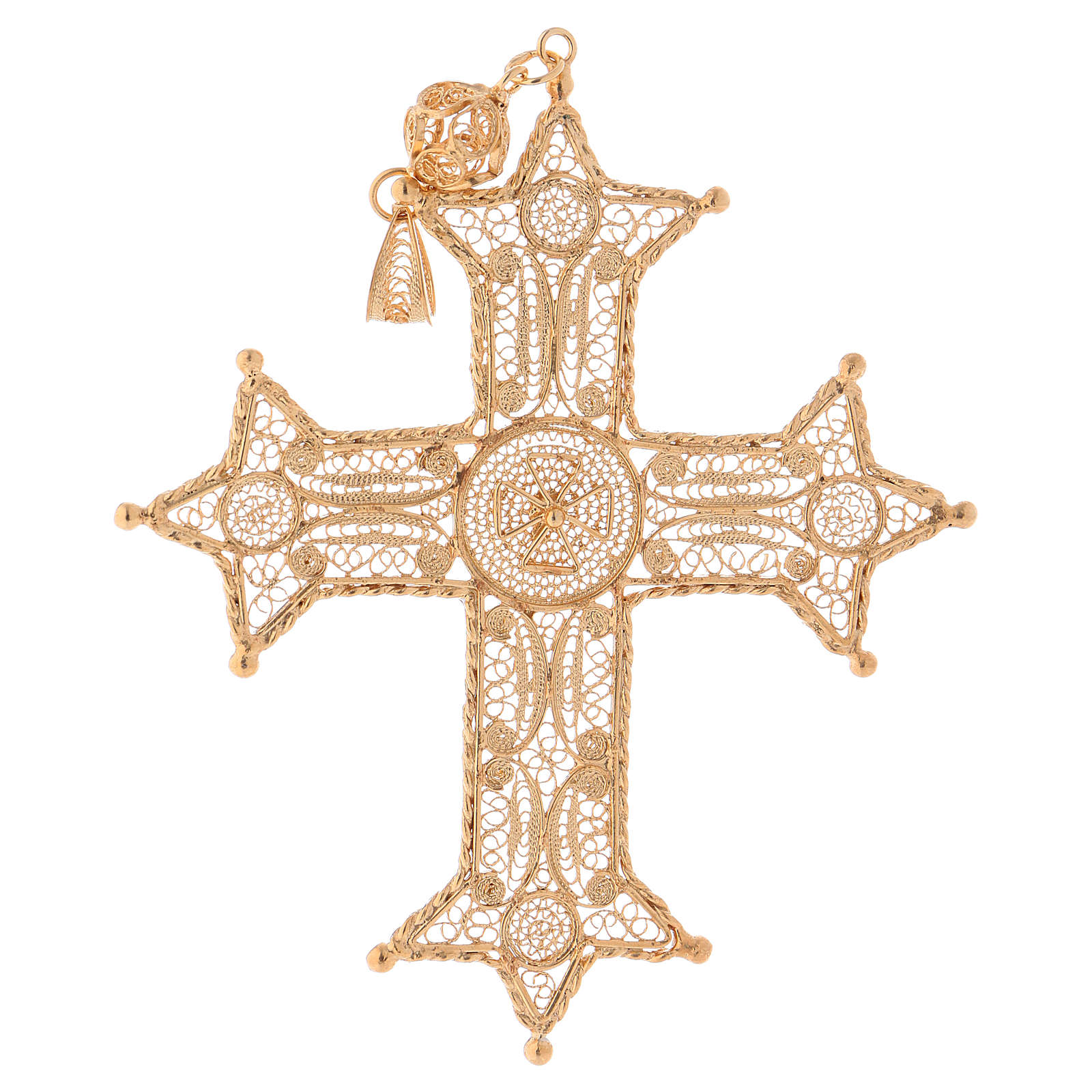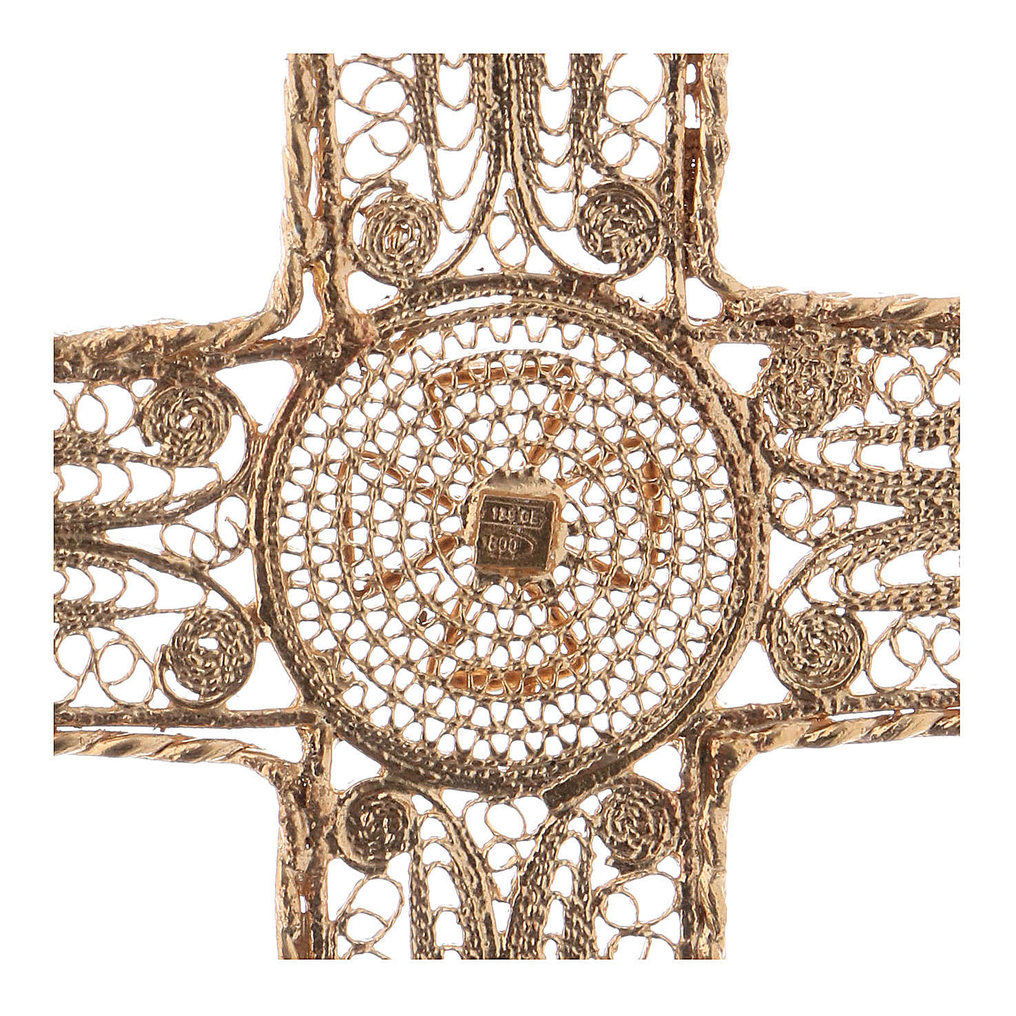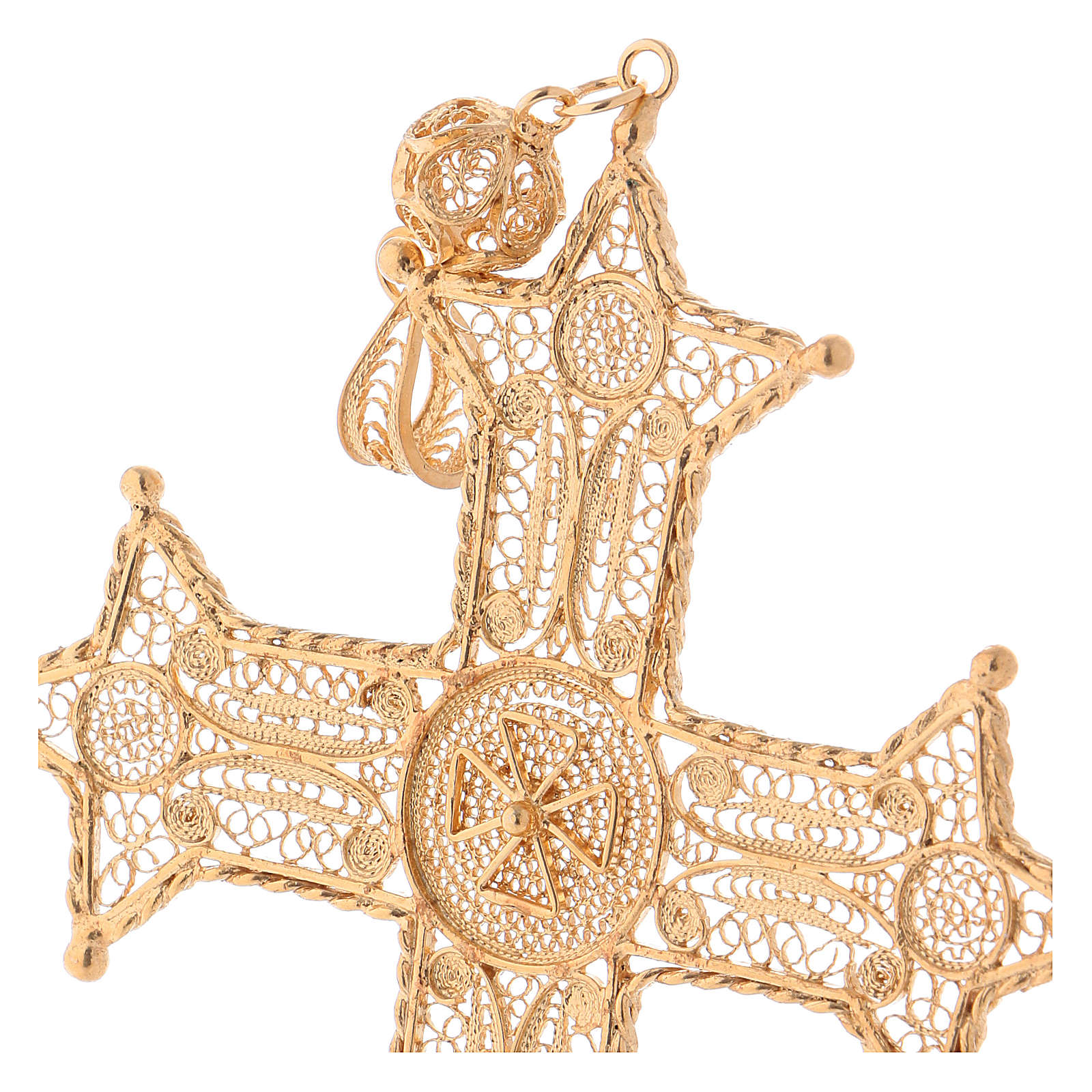 Burstkreuz Silber 800 Filigranarbeit und Dekorationen. Der Kreuz ist aus goldenen Silber mit Filigranarbeit und Dekorationen realisiert. Handwerkprodukt realisiert in Italien.