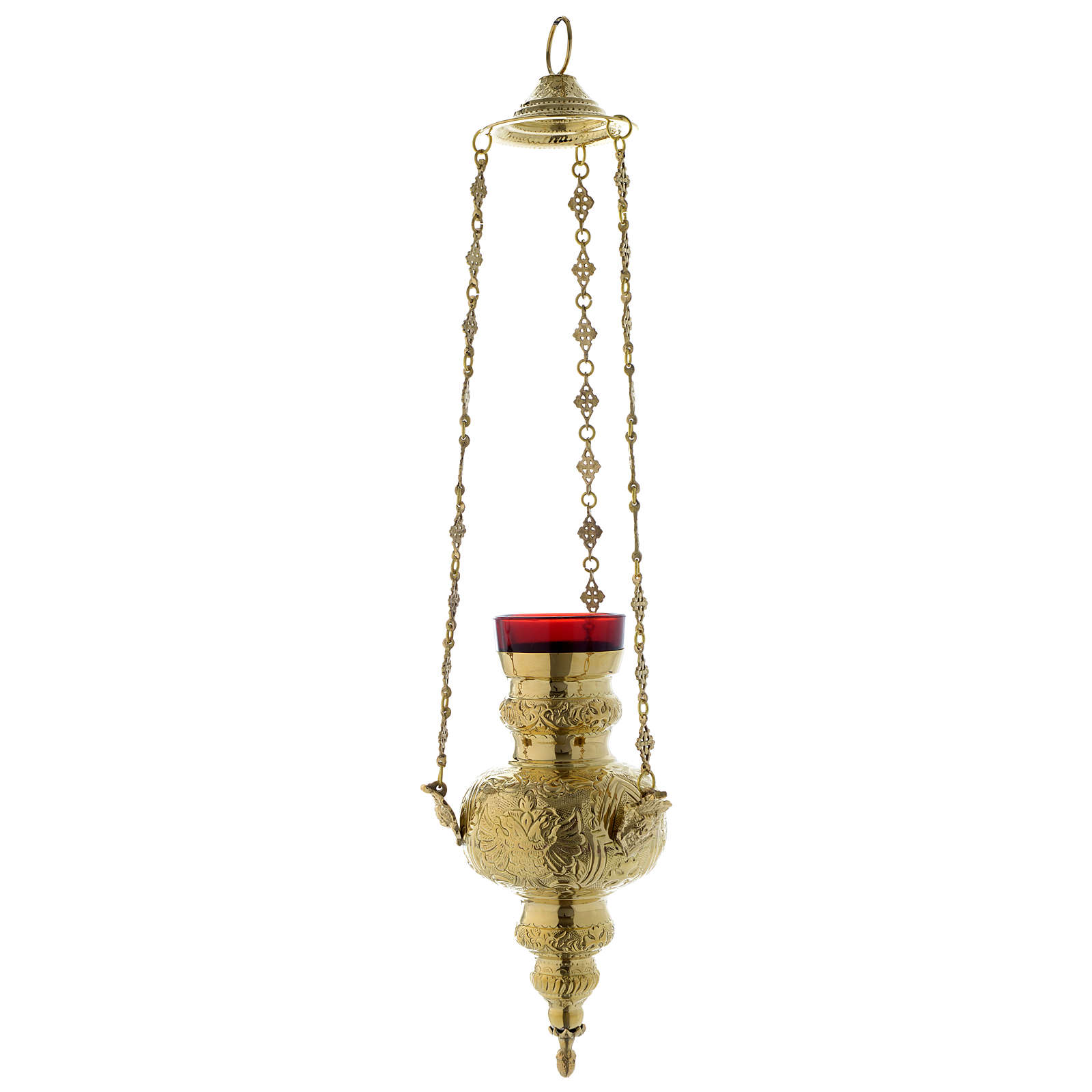 Allerheiligste Lamp für die Wand Blätter Dekorationen Messing 60cm. Allerheiligste Lamp realisiert aus vergoldeten Messing mit Blätter Dekorationen und Ketten für das Hängen an die Wand.