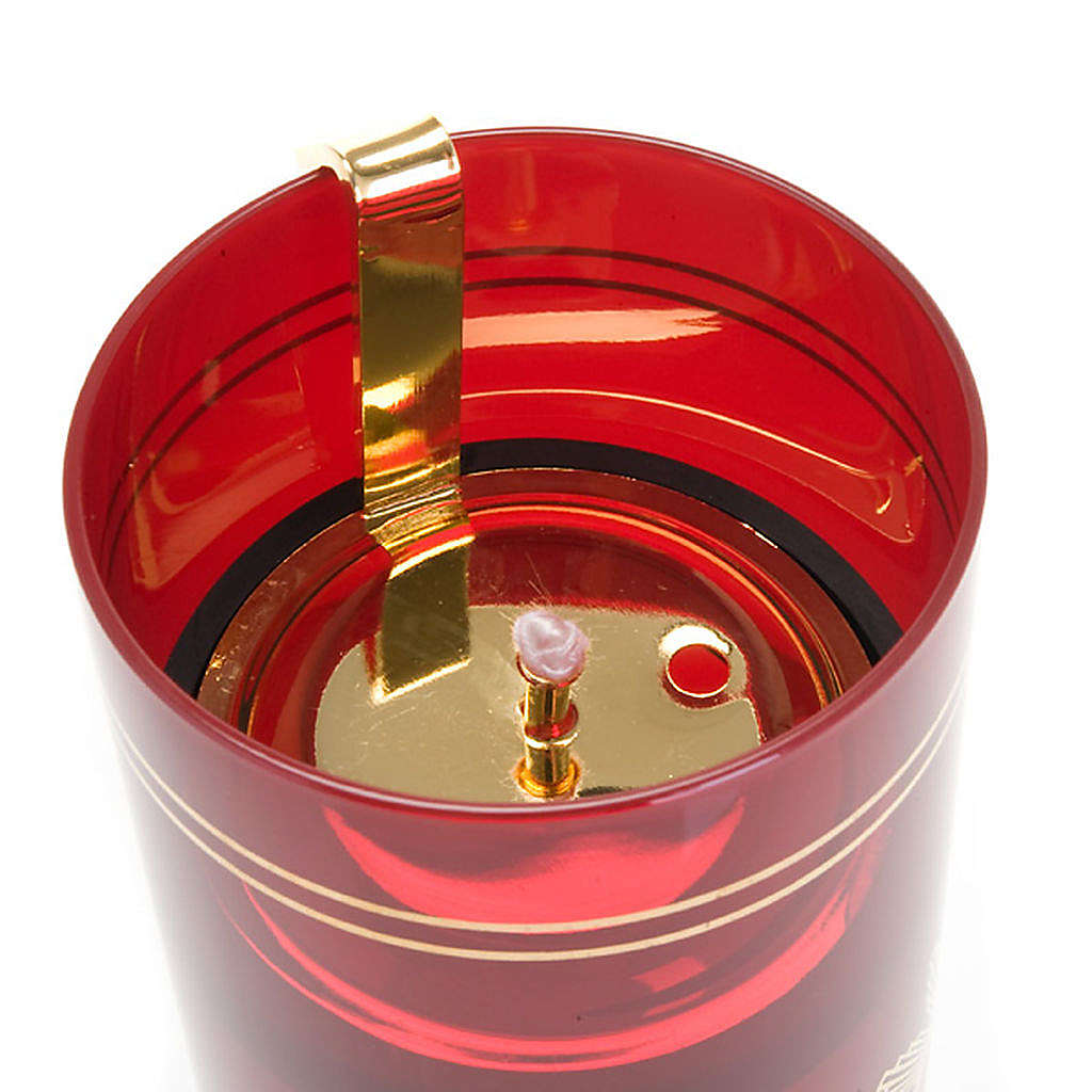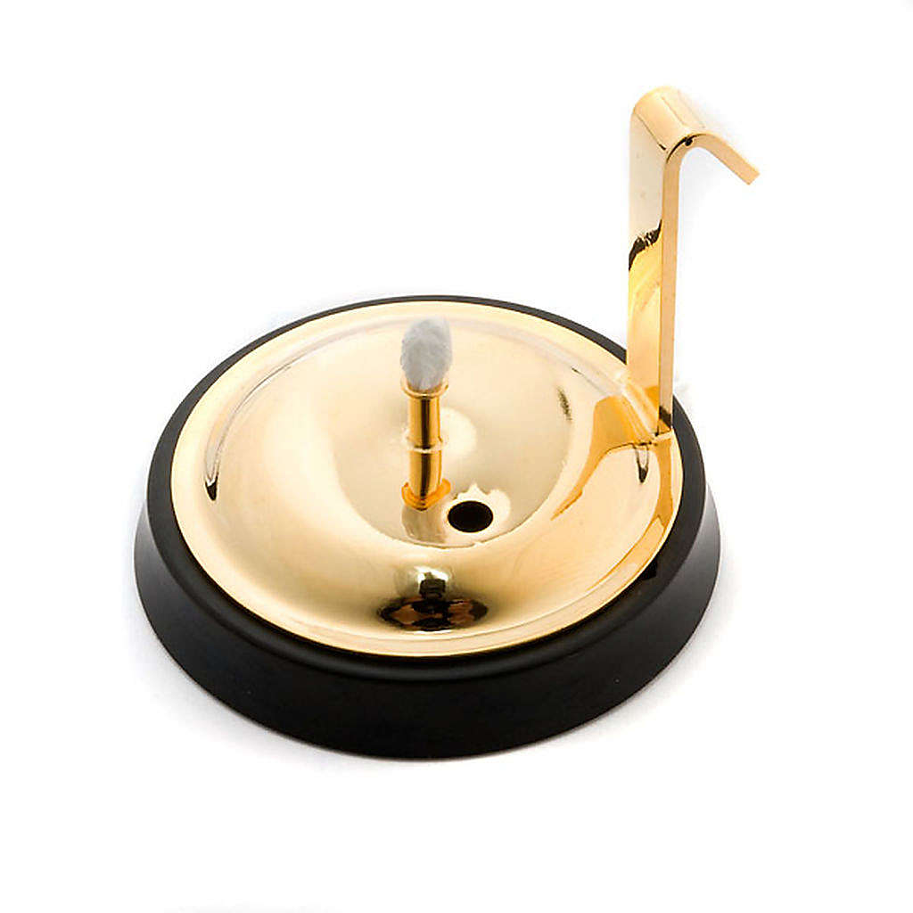 Dieser Flammenapparat funktioniert mit Flüssigwachs und kann zusammen mit dem roten Becher des Allerheiligsten benutzt werden. Der Apparat wird am Becherrand angehängt, der Docht saugt sich mit Flüssigwachs für die Verbrennung voll.