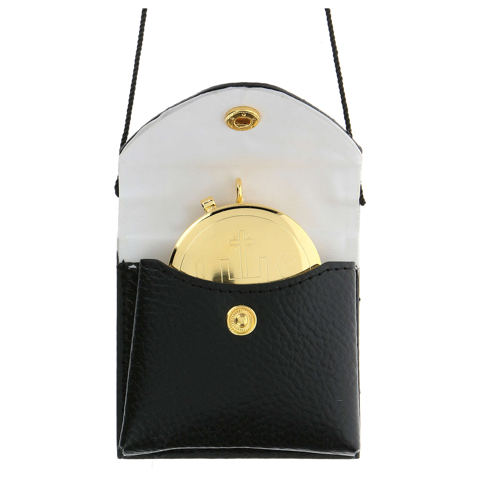 Behälter für Reliquiar mit Kreuz. Er enthält ein Reliquiar für Hostien aus Metall und mit 5 cm Durchmesser, und einen Zubehörteil für die Purifikation.