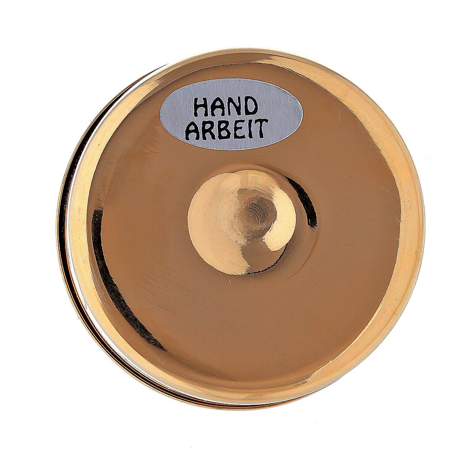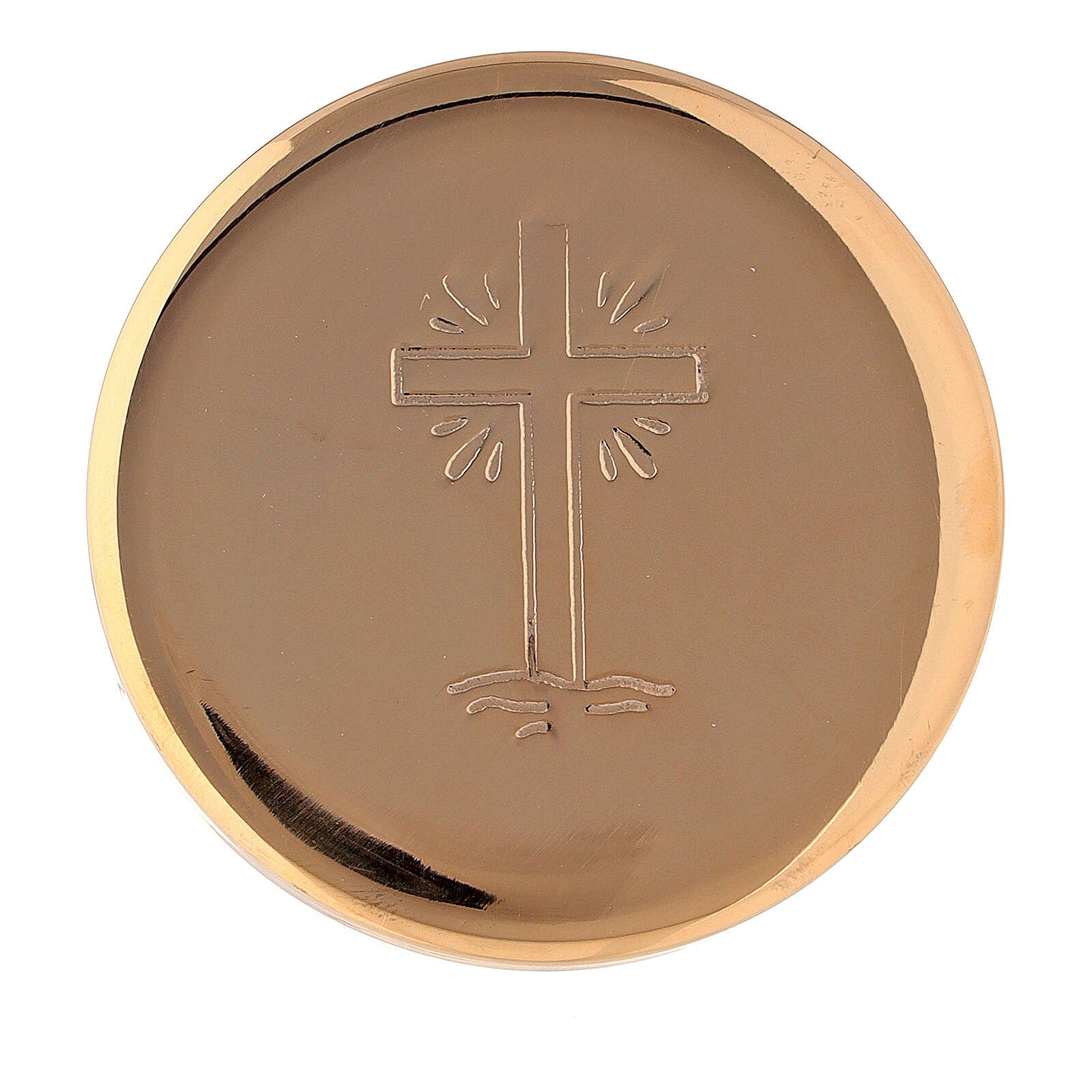 Eucharistische Versehpatene Kreuz mit Strahlen 5cm Messing. Eucharistische Versehpatene realisiert aus vergoldeten Messing, und verfeinert mit Gravierung eines Kreuzes und Strahlen.