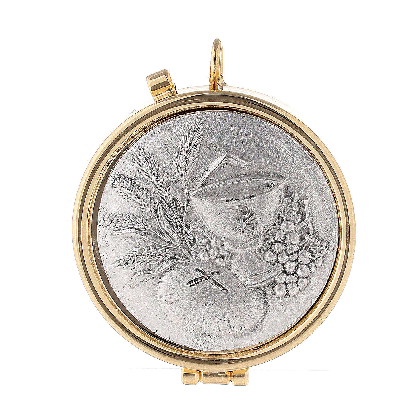 Eucharistische Versehpatene aus vergoldetem Metall, Innen wie Außen. Mit eucharistischen Symbolen Kelch und Ähren. Man kann um en Hlas zu tragen.