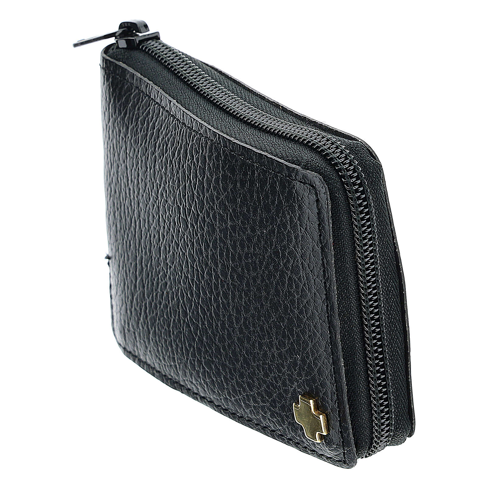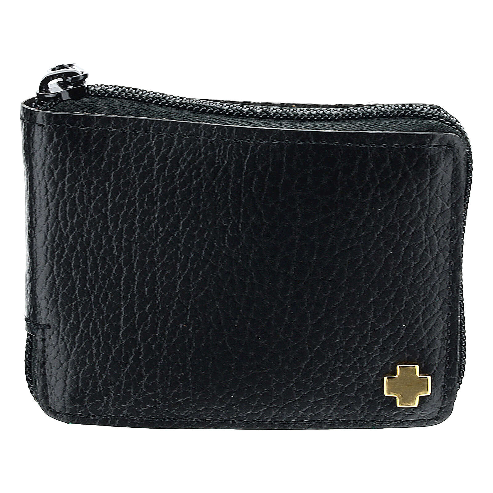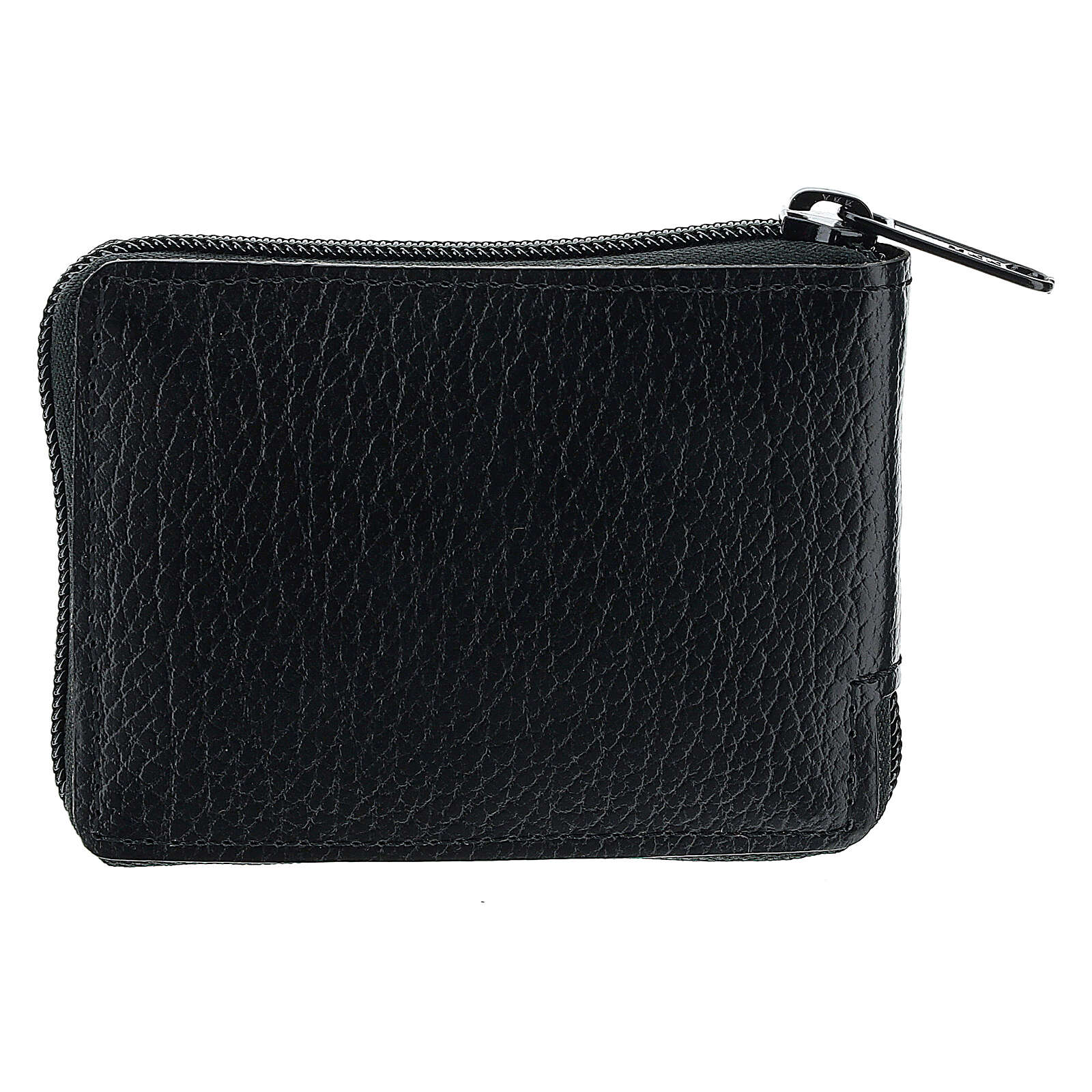 Reliquiarsetui Kalbleder schwarz, mit Reliquiar IHS und Kreuz. Mit elegantem Reissverschluss. Das Reliquiarsetui enthält ein Reliquiar aus Metall mit 5 cm Durchmesser, ein kleines Kreuzchen und einen kleinen Zubehörteil für Purifikation.