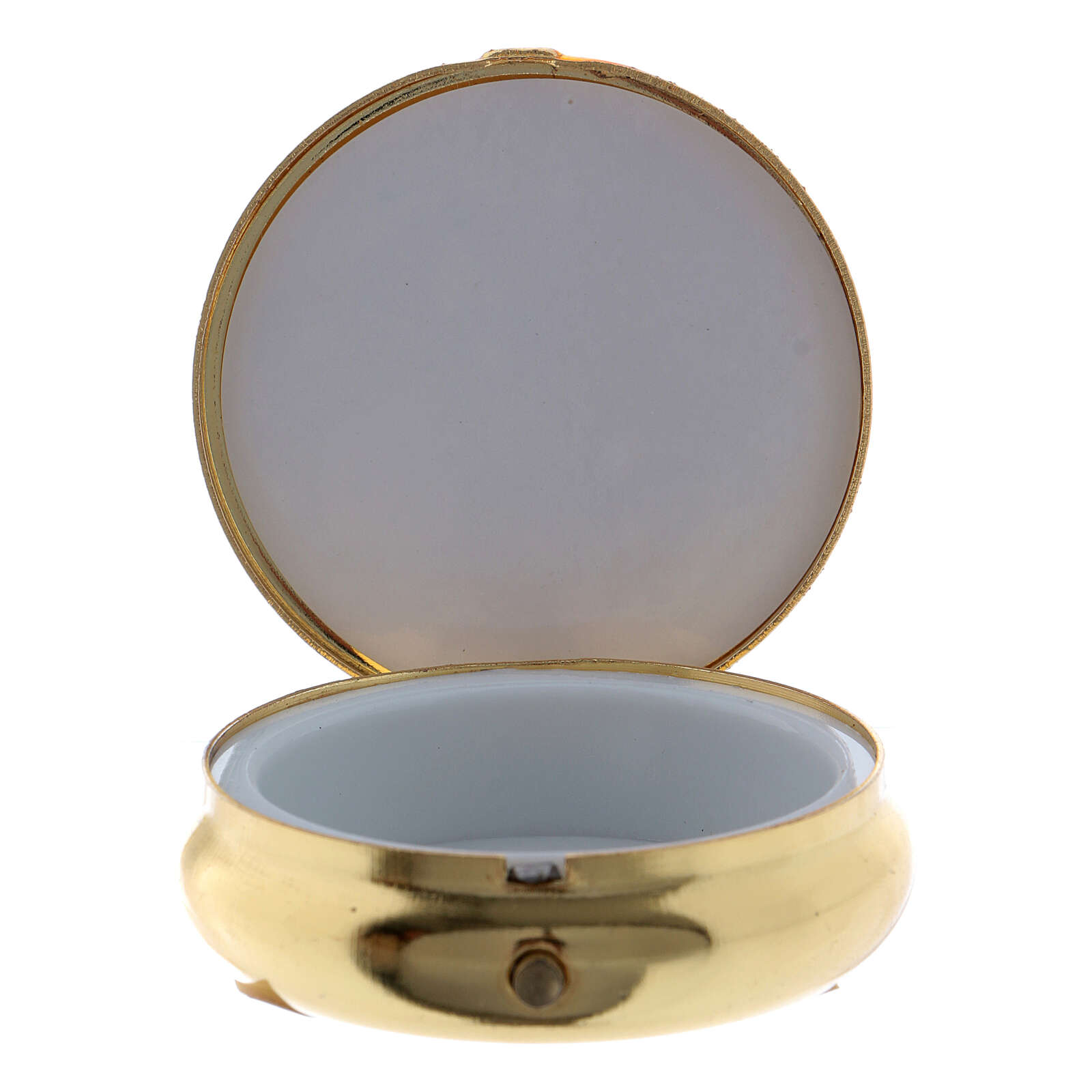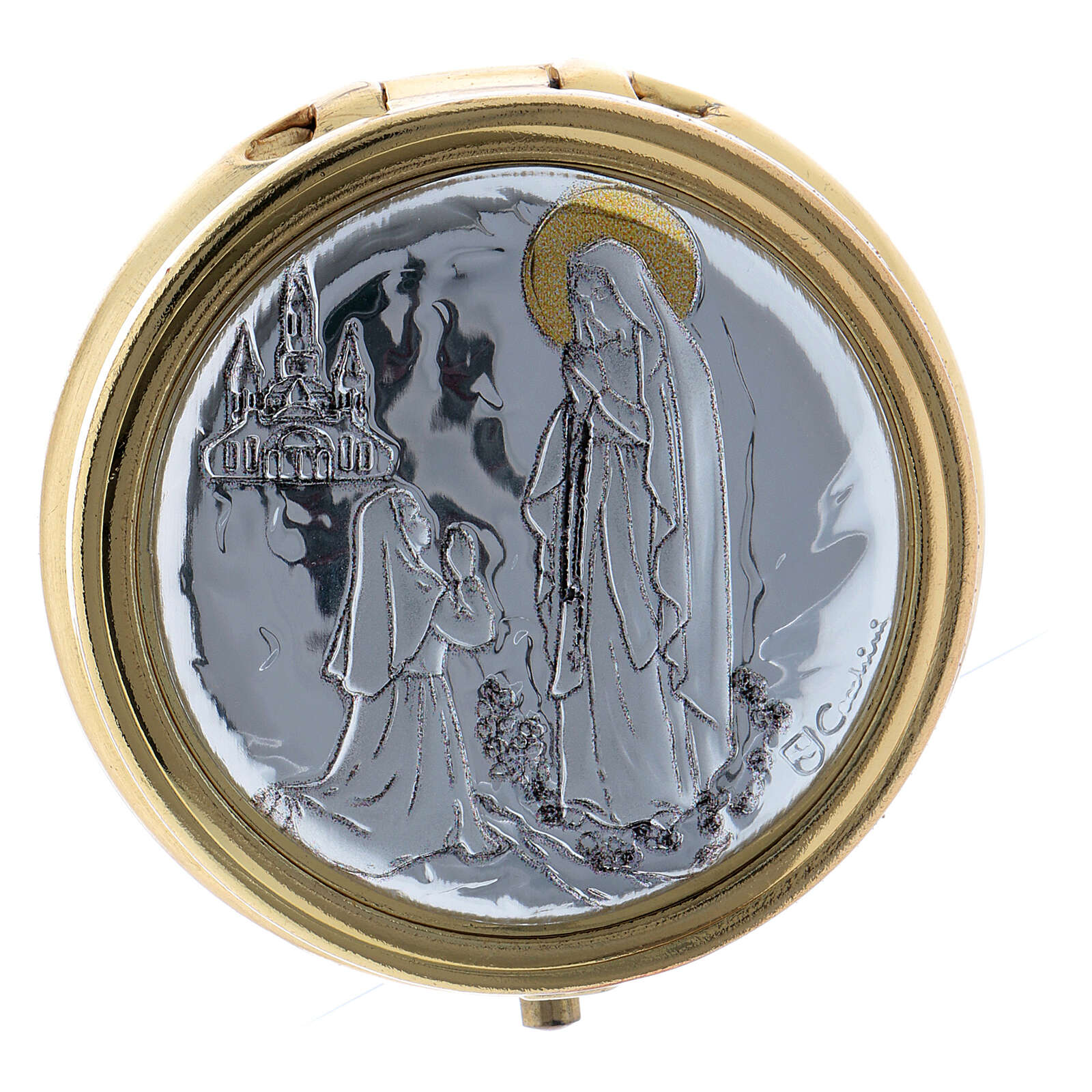 Versehpatene Messing Gottesmutter von Lourdes Aluminium Platte 5cm. Versehpatene realisiert aus vergoldeten Messing und verfeinert mit Bild der Gottesmutter von Lourdes auf einer Aluminum Platte.