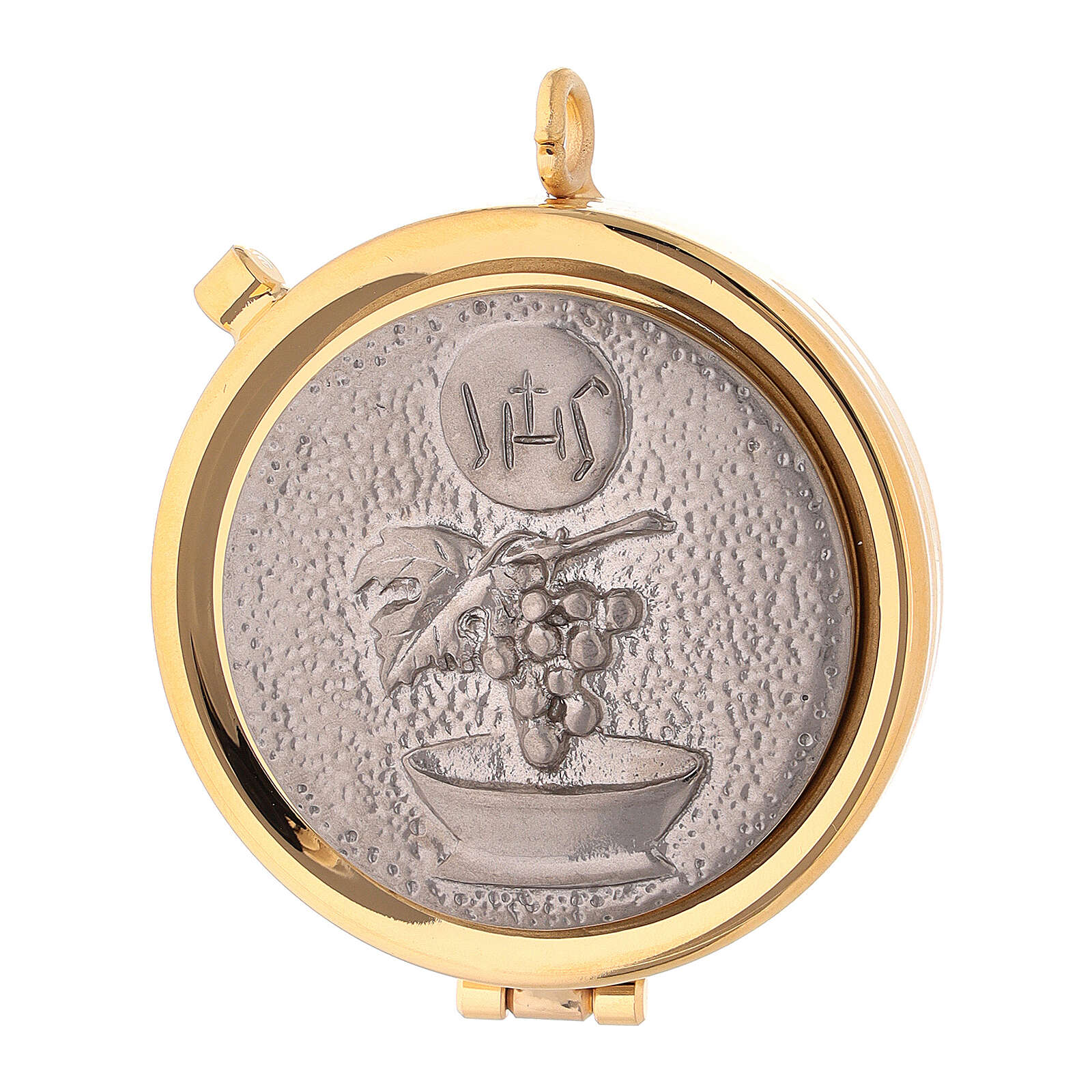 Versehpatene vergoldeten Messing IHS und Trauben Relief.Versehpatene realisiert aus vergoldeten Messing und verfeinert mit Schild mit Symbolen IHS und Trauben mit versilberten Finish.