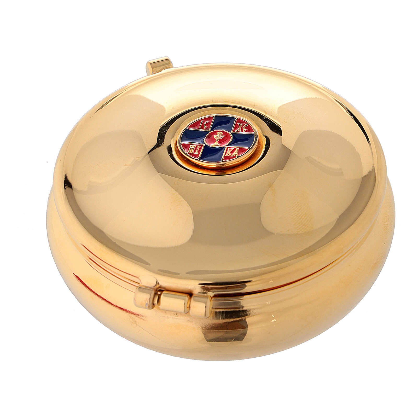 Versehpatene vergoldeten Messing Kreuz und Etui. Versehpatene realisiert aus vergoldeten Messing verfeinert mit einem Kreuz mit Emaillack auf dem Deckel.