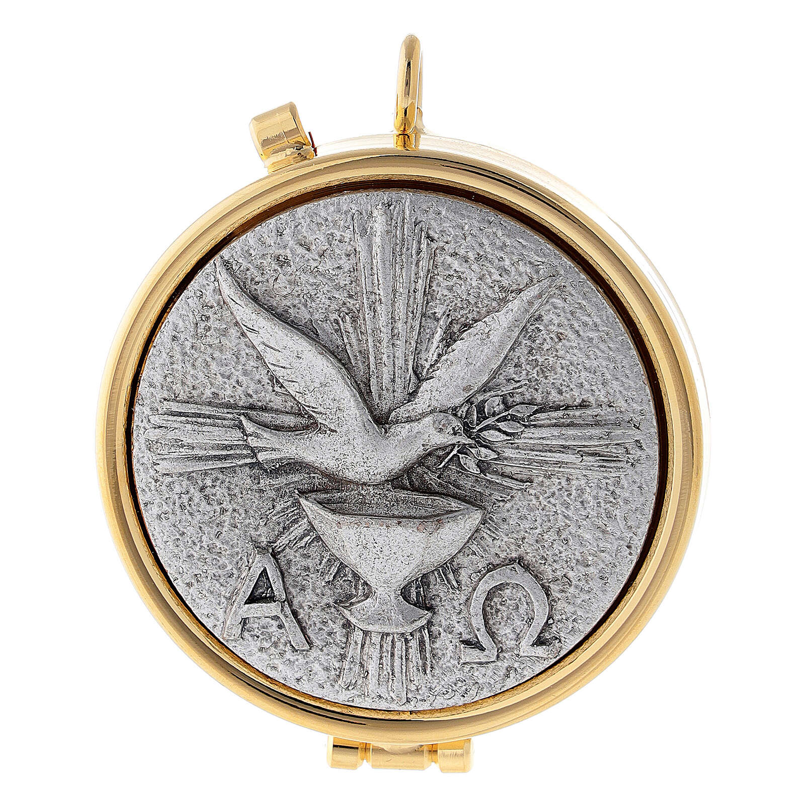 Eucharistische Versehpatene aus vergoldetem Messing, mit einer Platte aus Hartzinn auf dem Decken mit den Bilder von einer Taube und die Buchstaben Alpha und Omega als Vorsprung. Es hat ein Ring um den Hals zu hängen.
