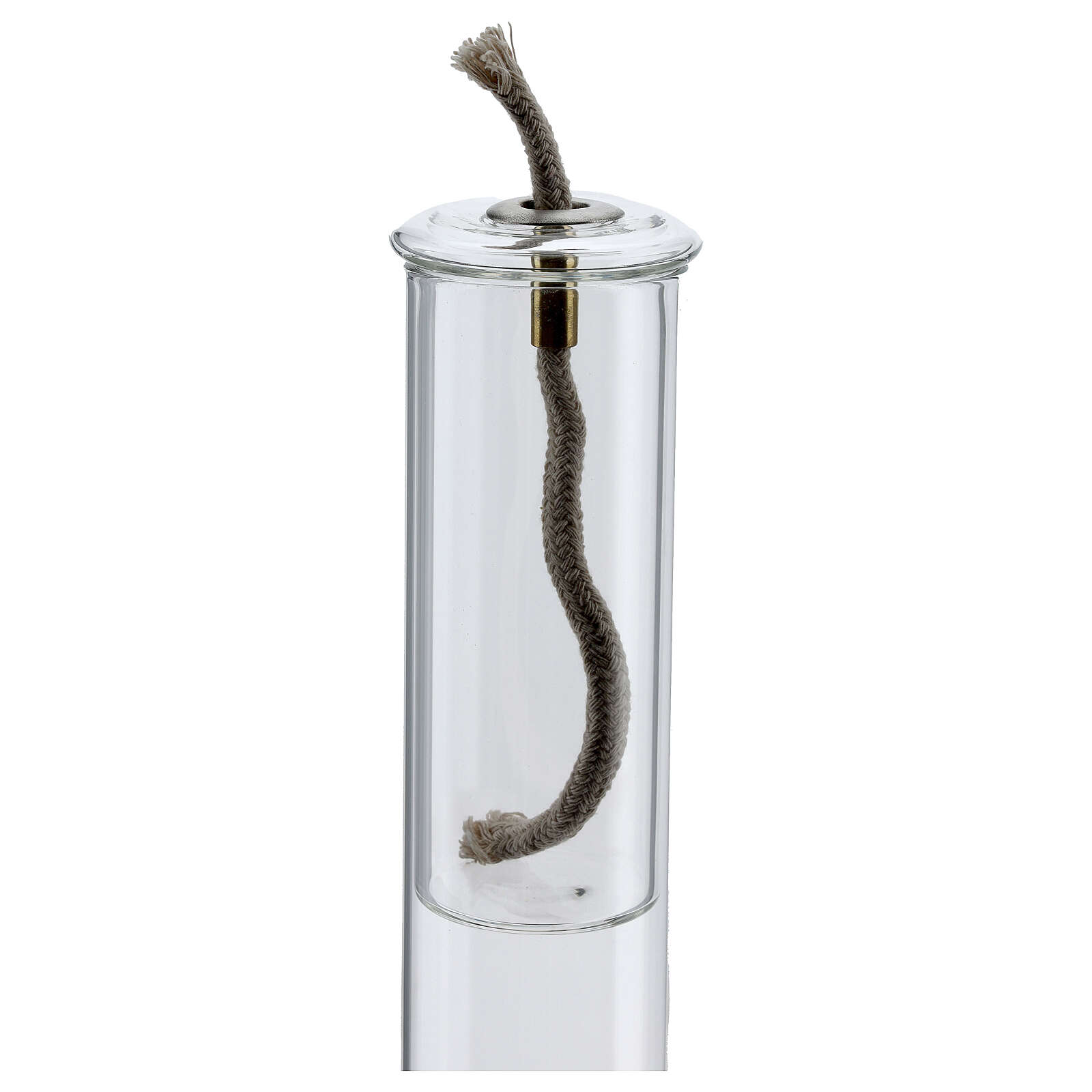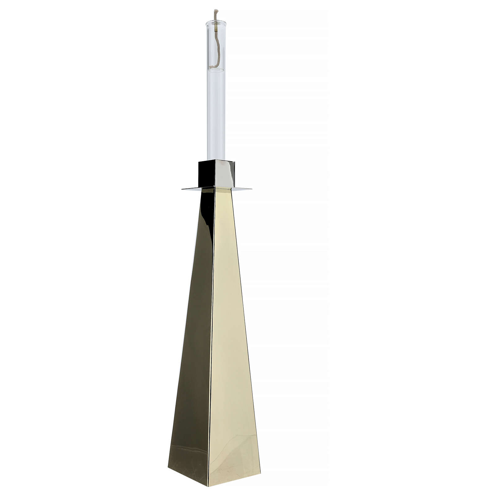 Dieser Leuchter kann als Altar-Leuchter oder als eucharistische Lampe für das Allerheiligste Sakrament benutzt werden, durch einen Zylinder aus Glas, der eine Öllampe stützt.
