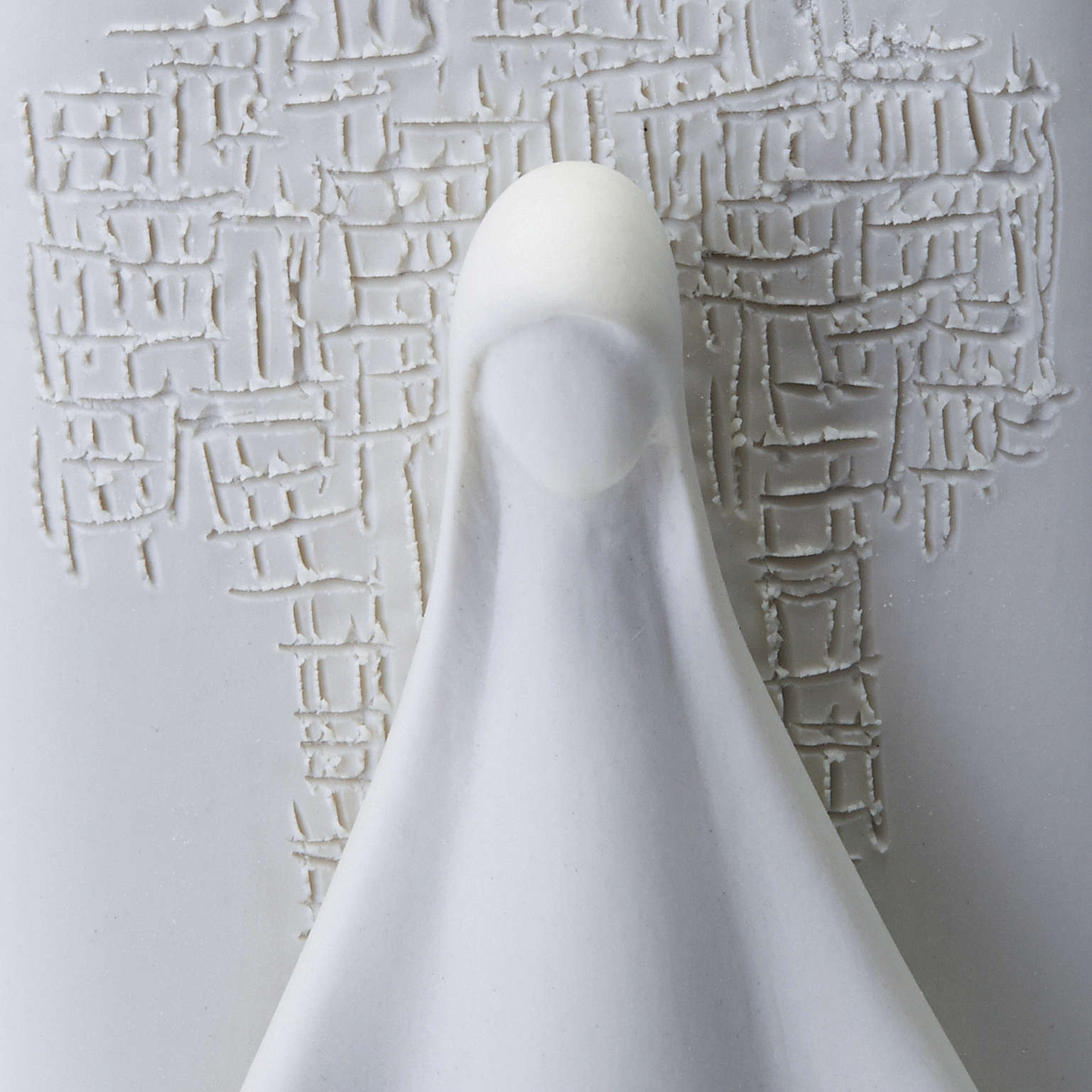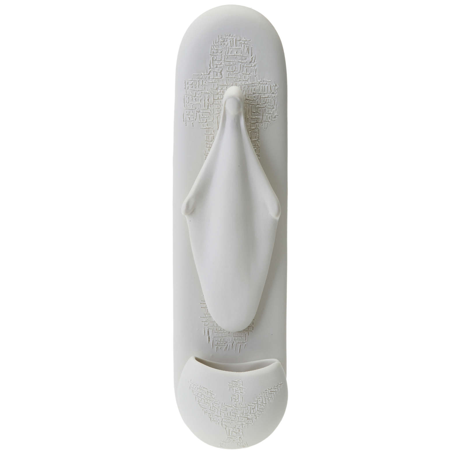 Elegantes Weihwasserbecken aus weißem Porzellan, angefertigt von Franceso Pinton. Die Skulptur zeigt eine stilisierte Madonna mit geöffenten Armen.