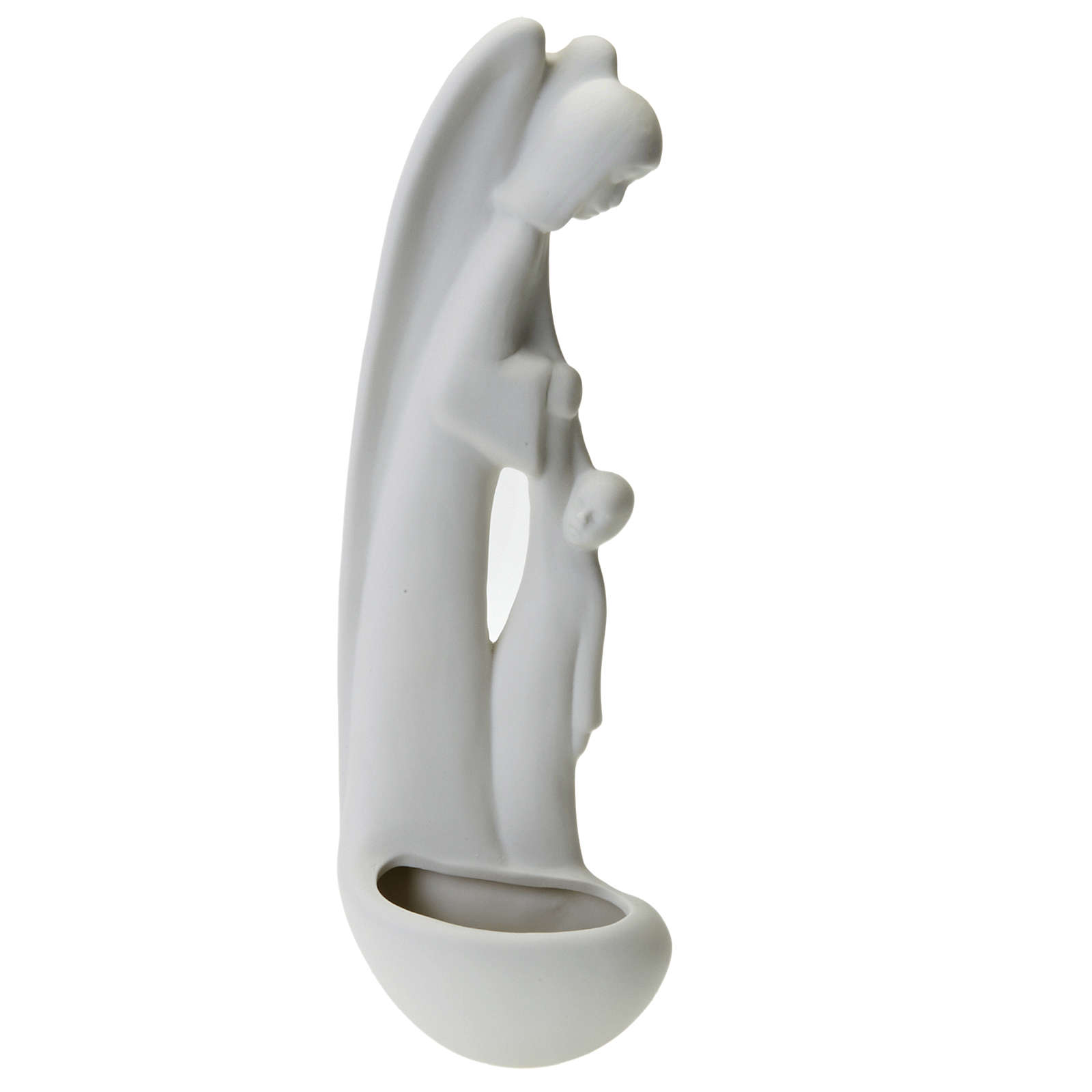 Weihwasserbecken aus weißem Porzellan, angefertigt von Franceso Pinton. Die Skulptur zeigt einen Schutzengel, der ein Kind an der Hand hält. Am Fuße der Skulptur findet man das Weihwasserbecken. Alles aus einem Stück.