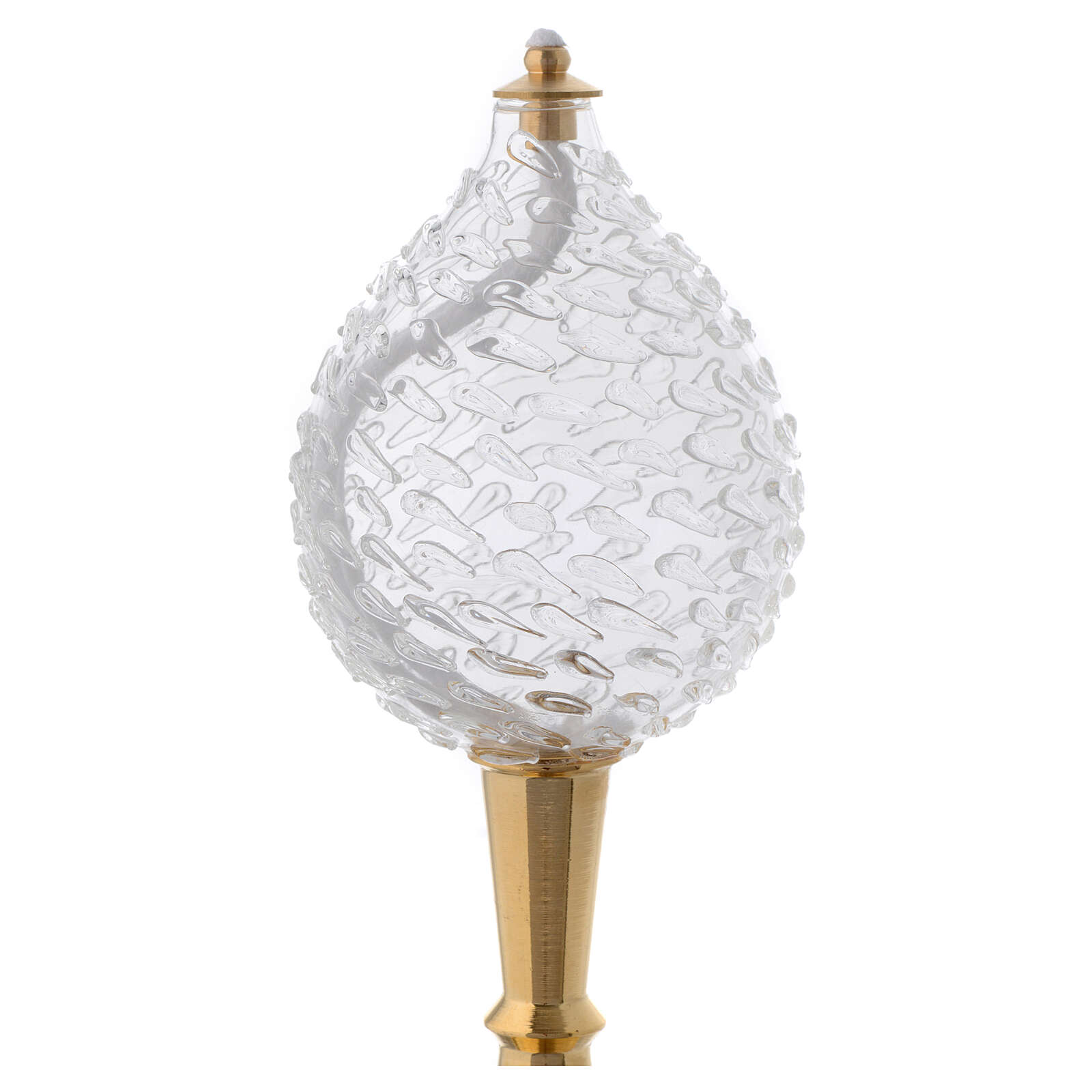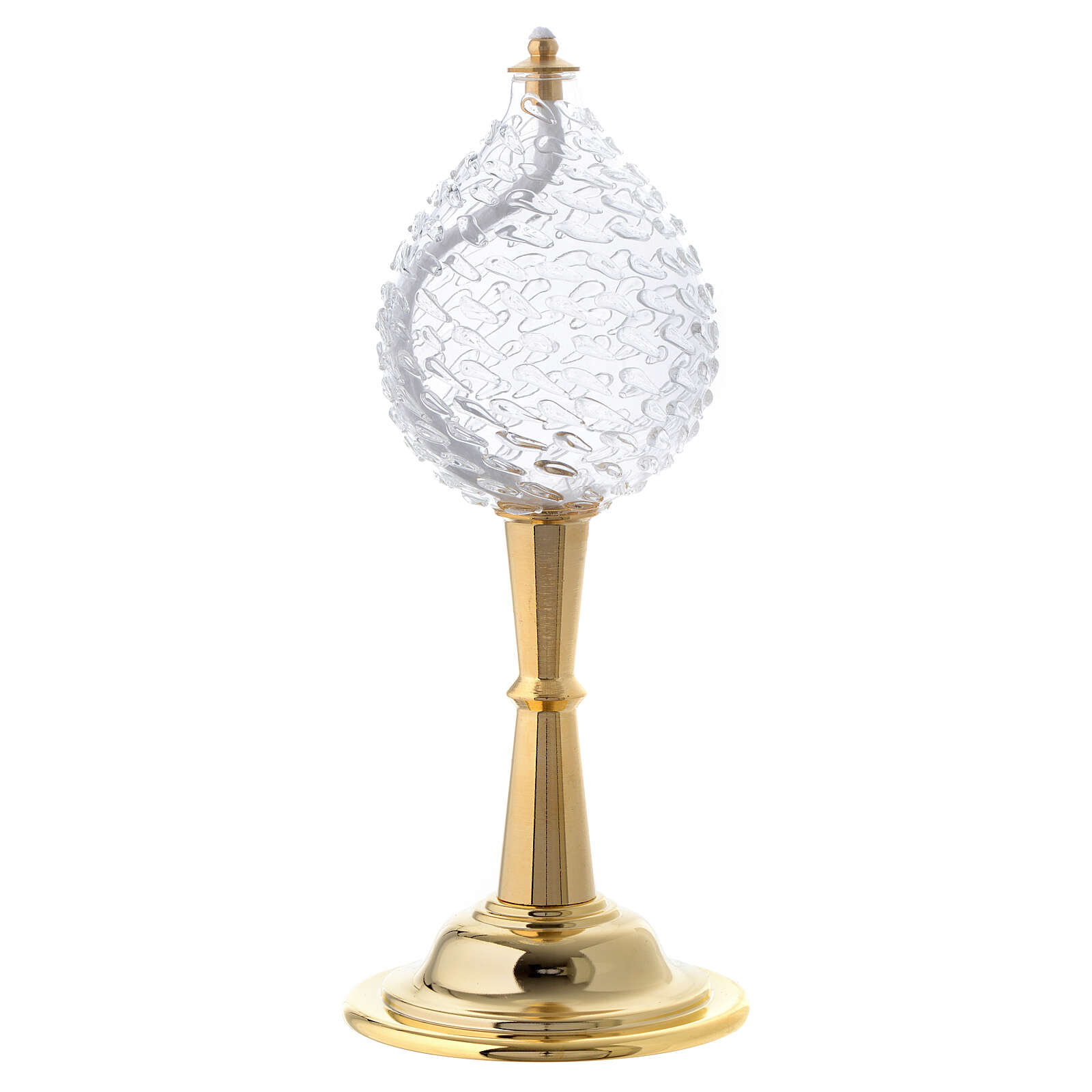 Altarlampe, als Öllampe ausgeführt. Die Glaslampe ist mit Tröpfchen verziert und ruht auf einem hohen, eleganten Standfuß aus Messing.