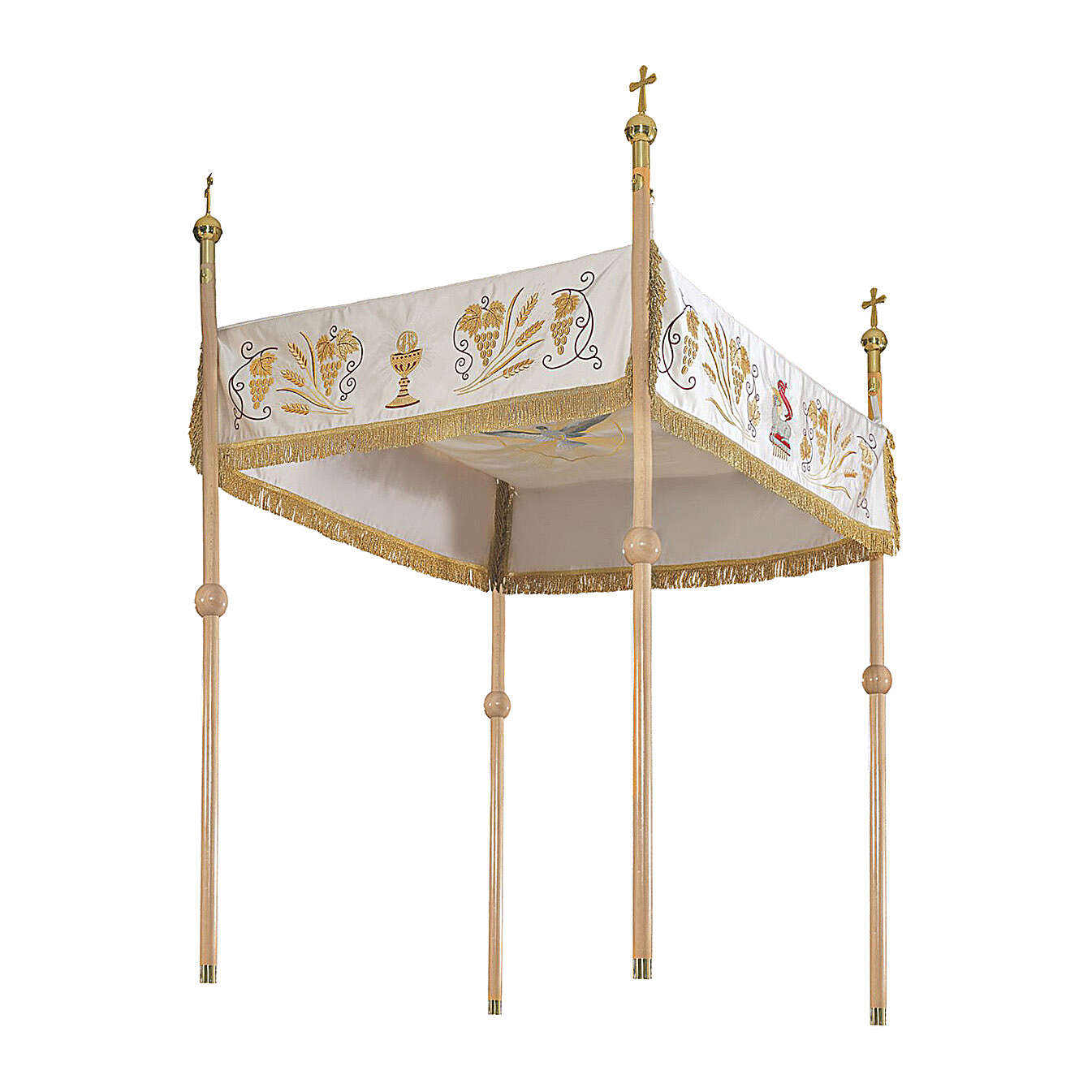 Baldachin Kommunionsymbole und Trauben 160x200cm. Baldachin realisiert aus Polyester und bestickt mit den Kommunionsymbolen, wie Kelch und Agnus Dei und verfeinert mit Trauben auf den 4 Seiten.
