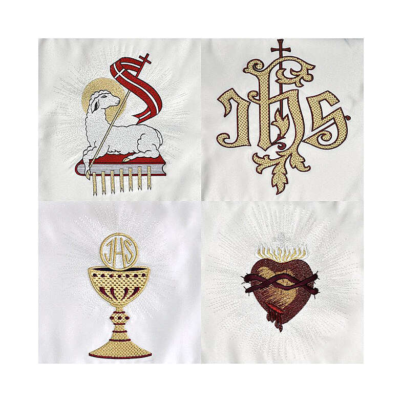Baldachin Kommunionsymbole und Trauben 160x250cm. Baldachin realisiert aus Polyester und bestickt mit den Kommunionsymbolen, wie Kelch und Agnus Dei und verfeinert mit Trauben auf den 4 Seiten.