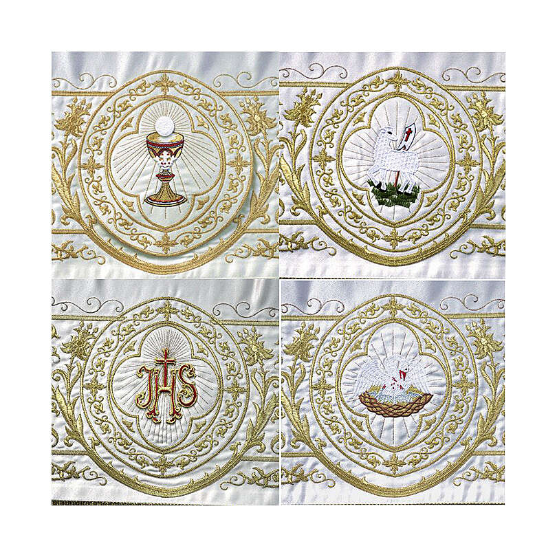 Baldaching IHS Schrift und Agnus Dei 160x250cm. Baldachin realisiert aus Polyester und bestickt mit dem Agnus Dei und dem Schrift IHS.