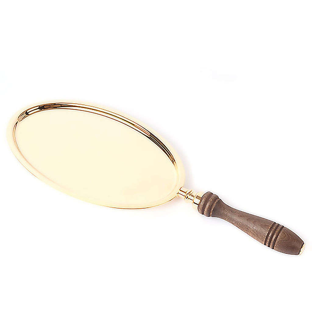 Schale aus vergoldeten Messing fuer die Eucharestie. Sie hat ein Holzgriff dass sehr bequem fuer die Ministranten ist um den Priester zu folgen und um die Hostien-Fall zu vermeiden.