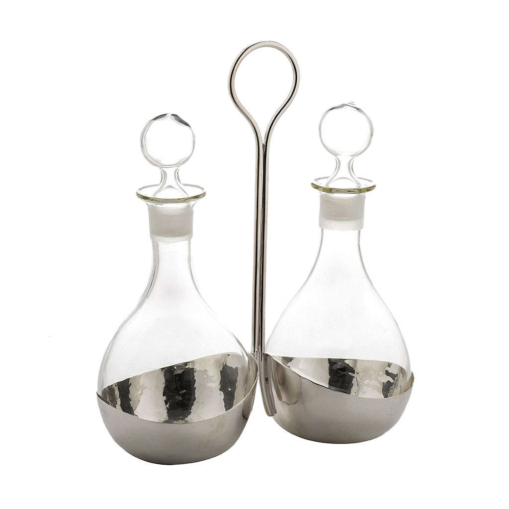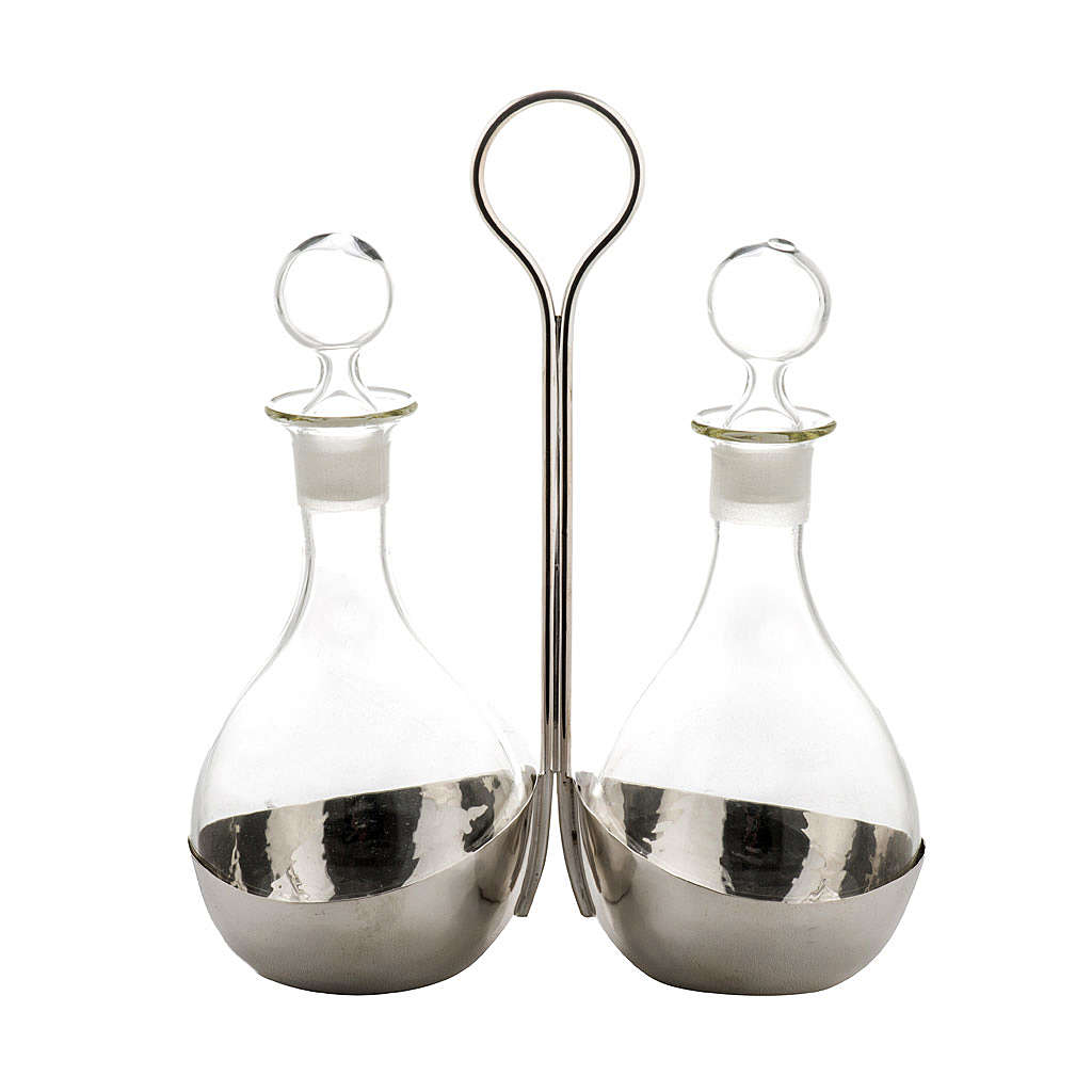 Messkännchengarnitur Muranoglas mit Gestell aus Messing. Messkännchen aus geblasenem Muranoglas, mit der traditionellen Technik handgemacht; das Gestell wird später gemacht, eigens für die Kännchen; es besteht aus vernickeltem Messing, von Hand gehämmert. Zeitgenössische Messkännchengarnitur.