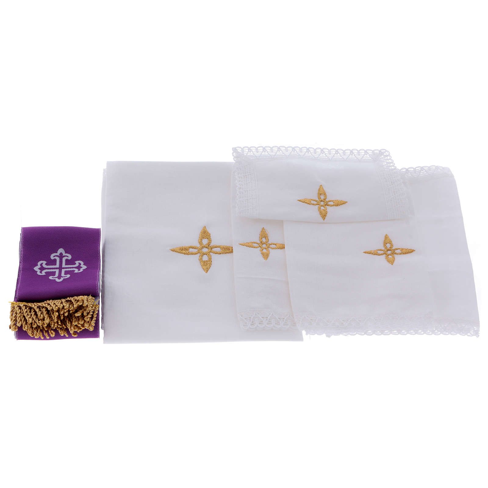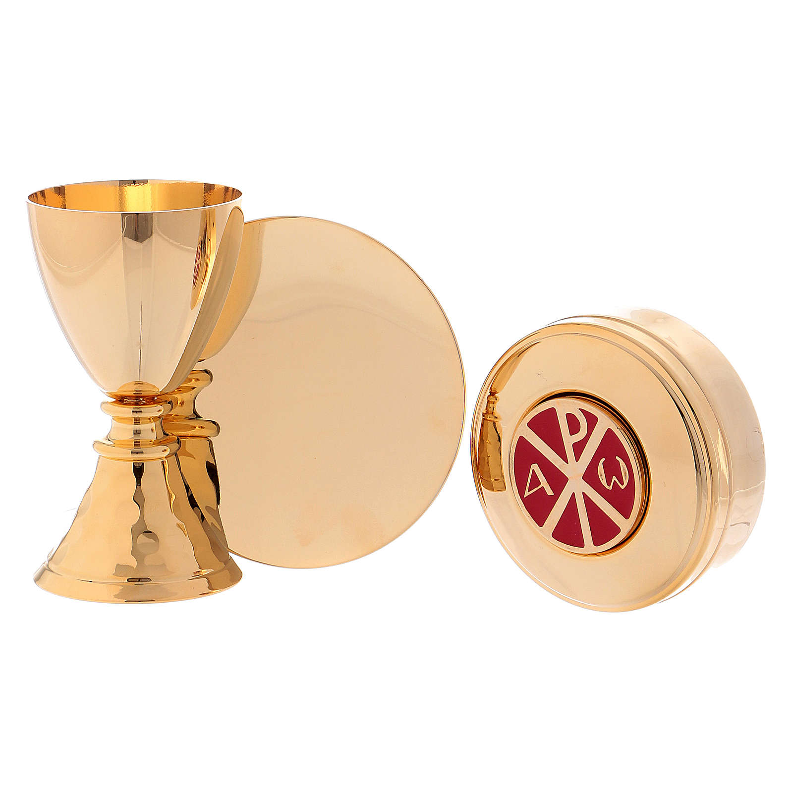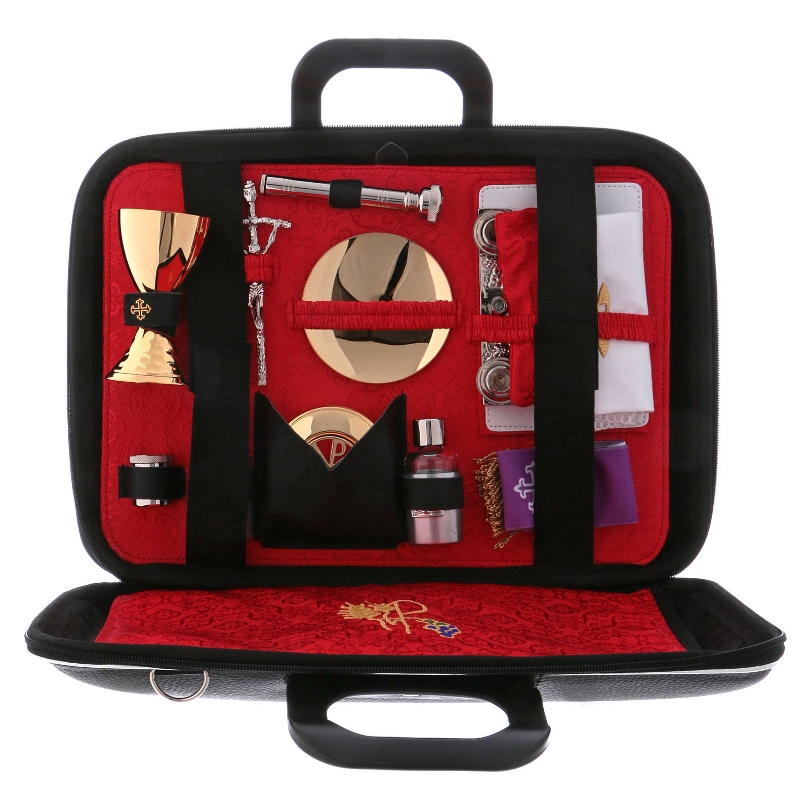 Die Tasche enthält: einen Kelch aus Messing mit Goldbad 24Kt, einen Kelchteller, eine Hostiendose mit roten Emaillack Dekorationen, einen Ölgefäß, ein Aspergill, zwei Fläschchen für Wein und Wasser, einen Altar mit Kreuz und zwei Kerzen, Kelchwäsche mit Kreuzstickerei, und eine kleine Stola.