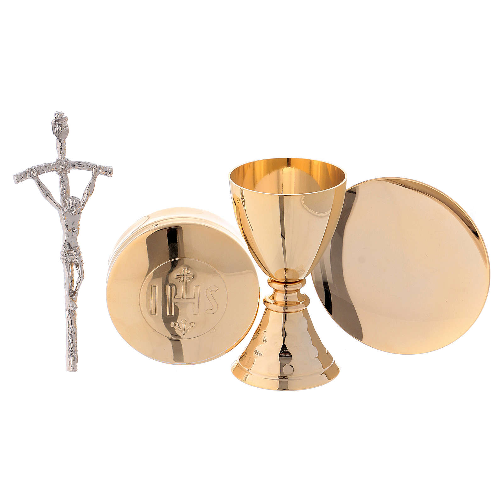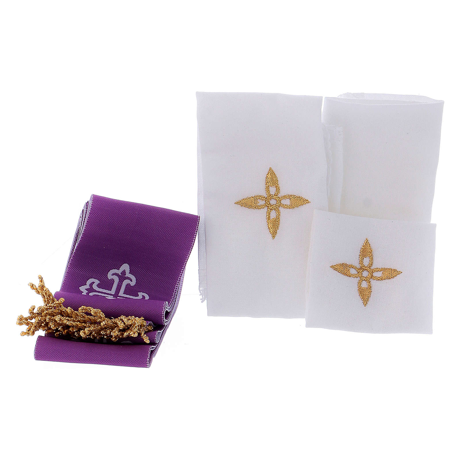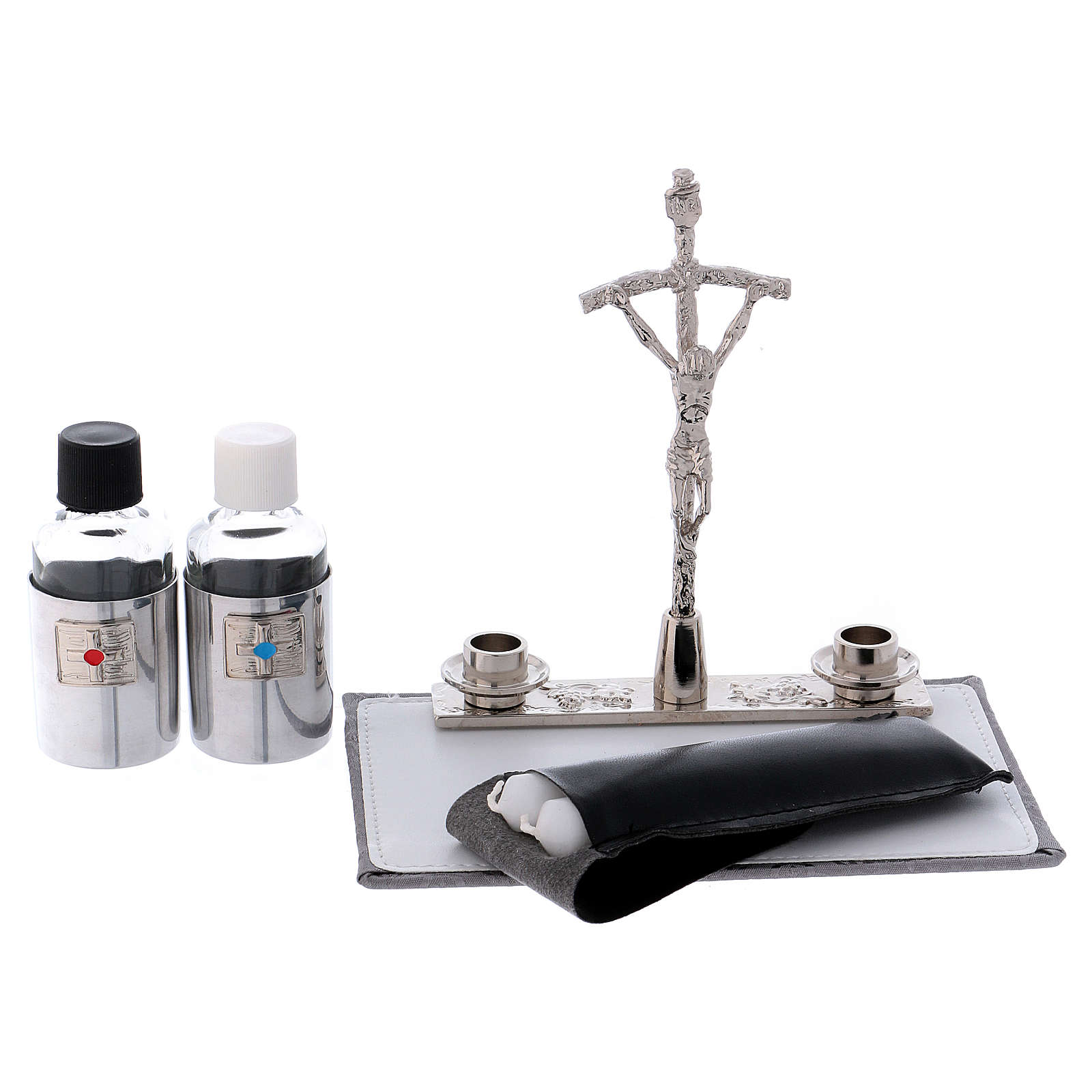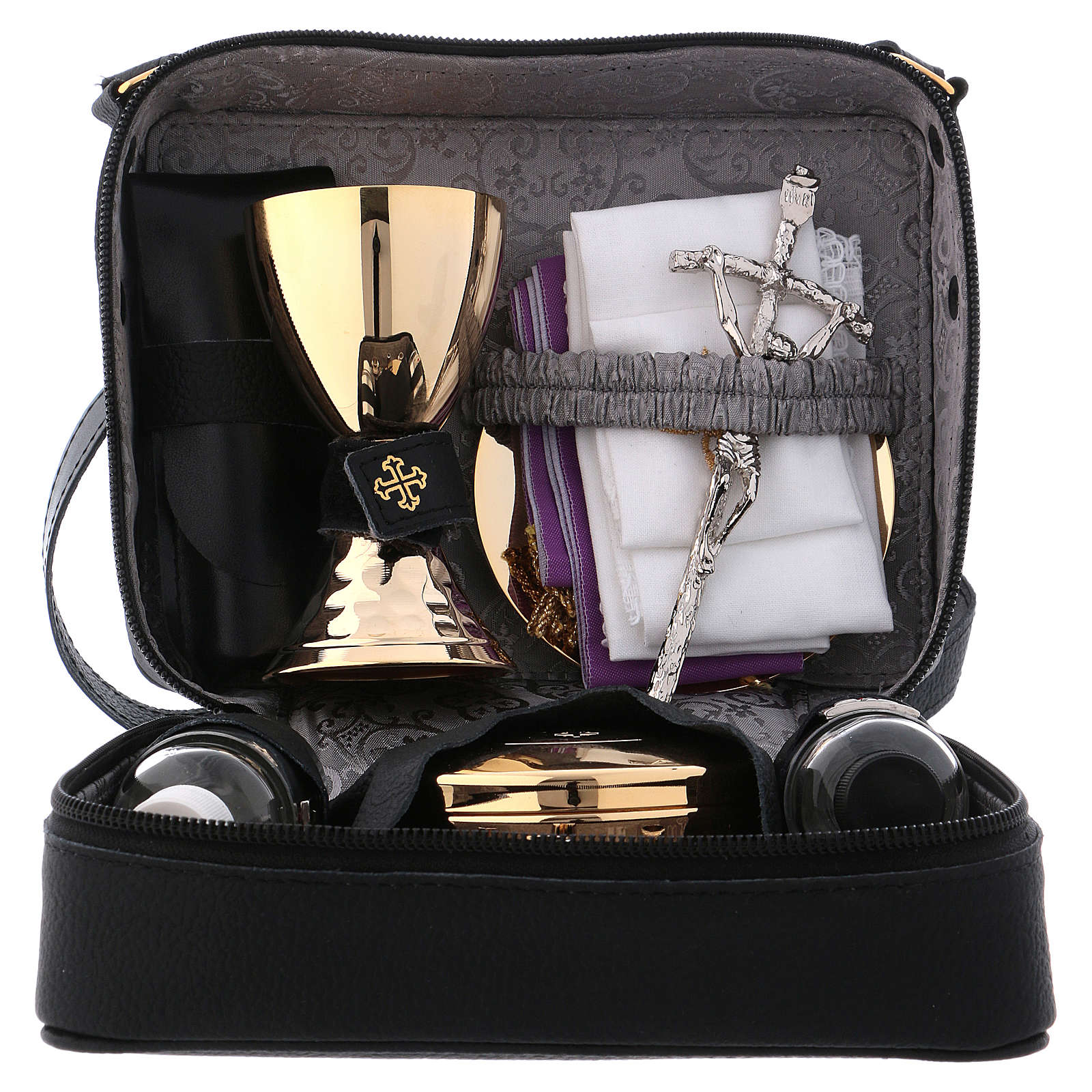 Die Tasche enthält: einen Messing Kelch, eine Hostiendose mit Durchmesser 8cm und IHS Gravierung, einen Kelchteller, Kelchtücher aus Baumwolle, eine kleine Stola, zwei Fläschchen für Wein und Wasser, einen kleinen Altar, ein Kreuz und zwei Kerzen.