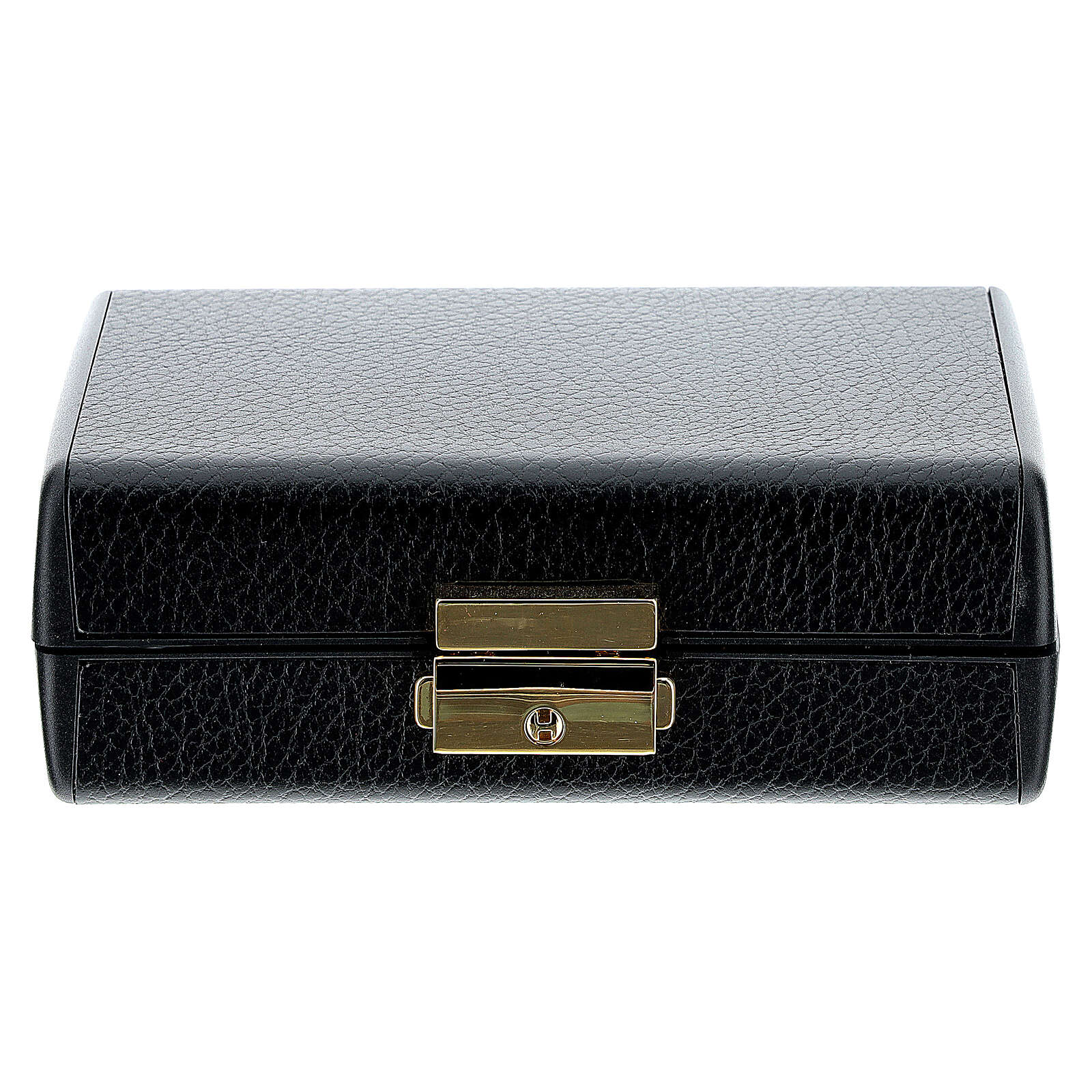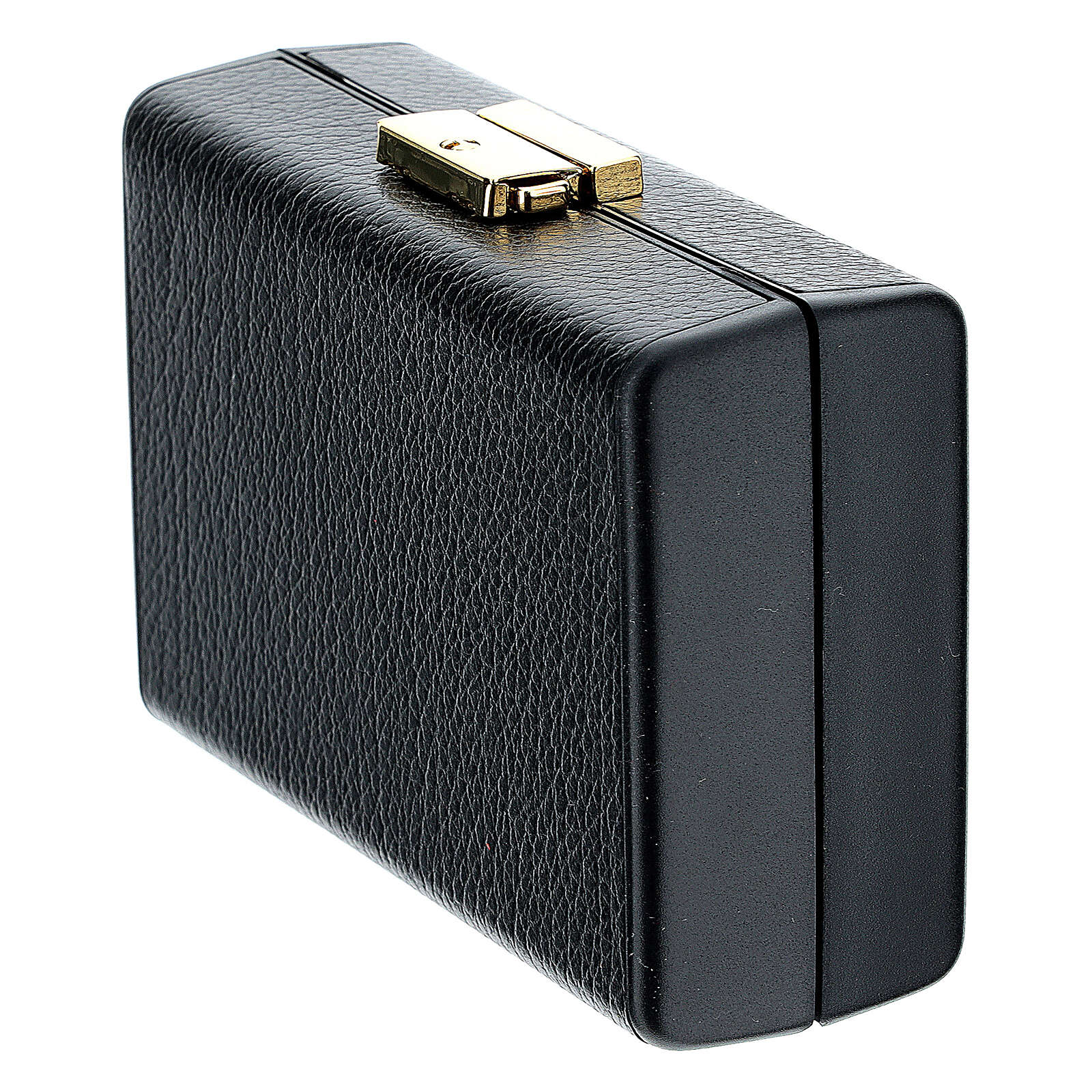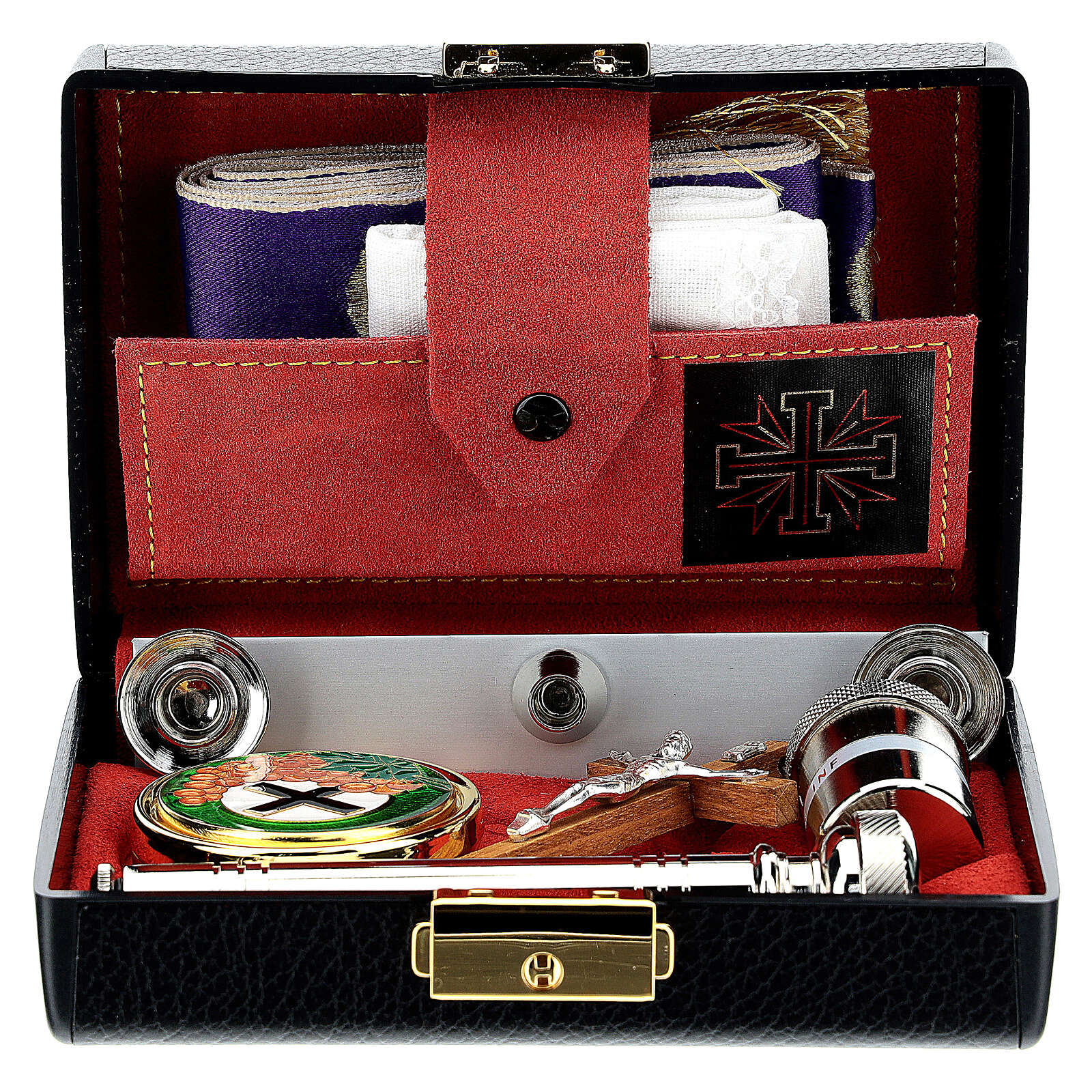 Kästchen Mensa und Sterbesakramente, mit Leder bedeckt. Es enthält: Geschirr für Mensa, kleines Kruzifix, emailliertes Reliquiar aus Metall, Asperges, Gläschen für heilige Öle.