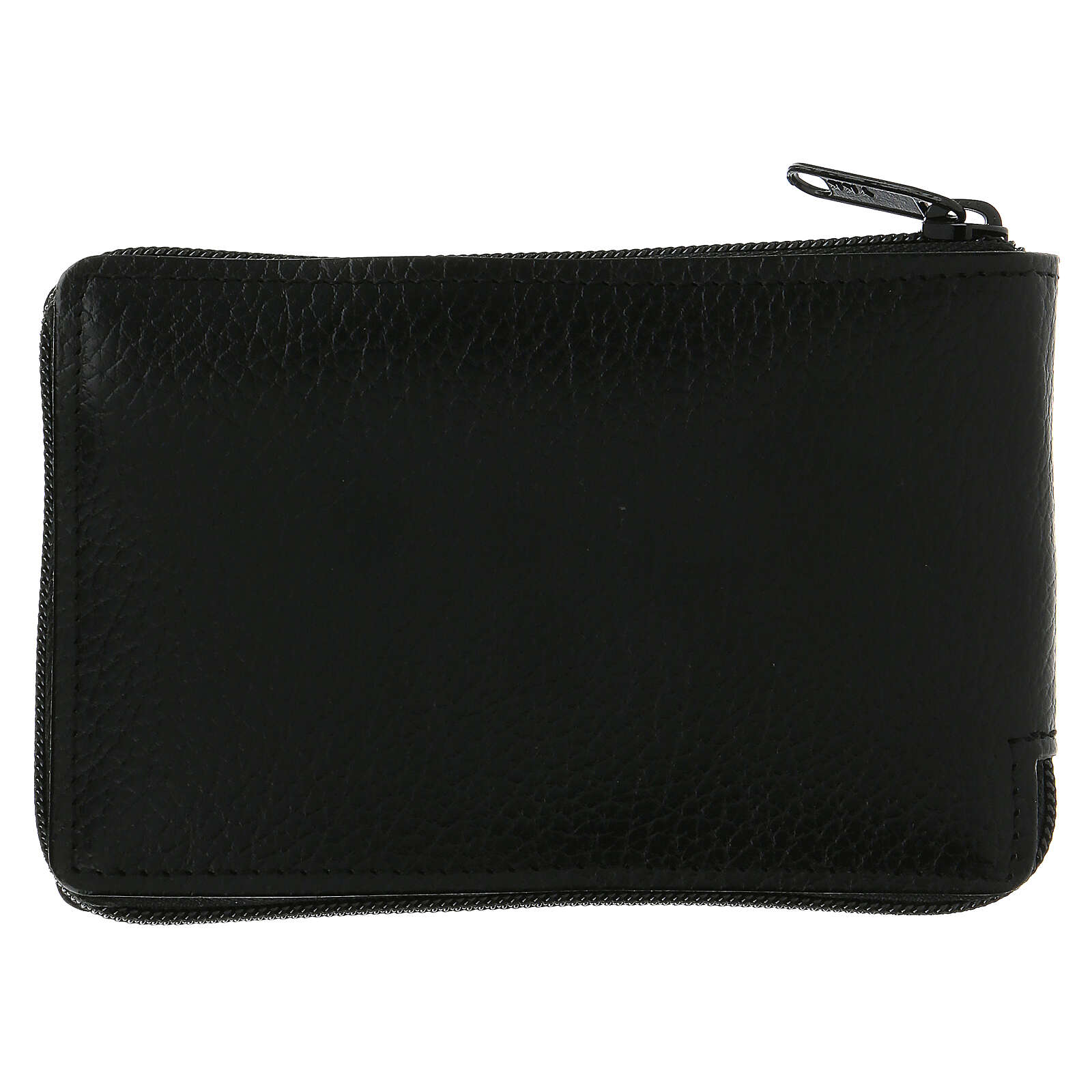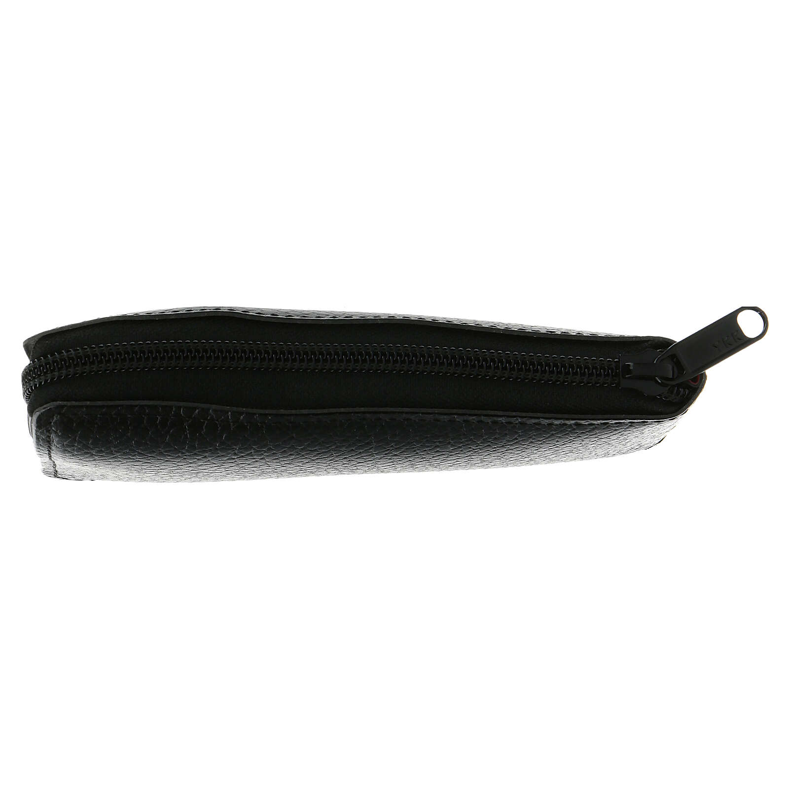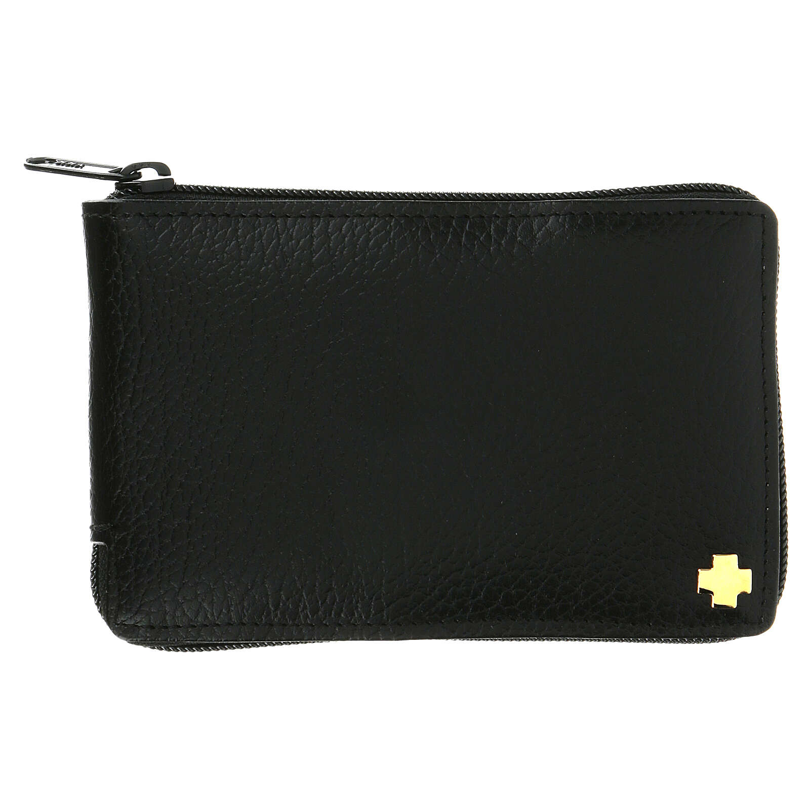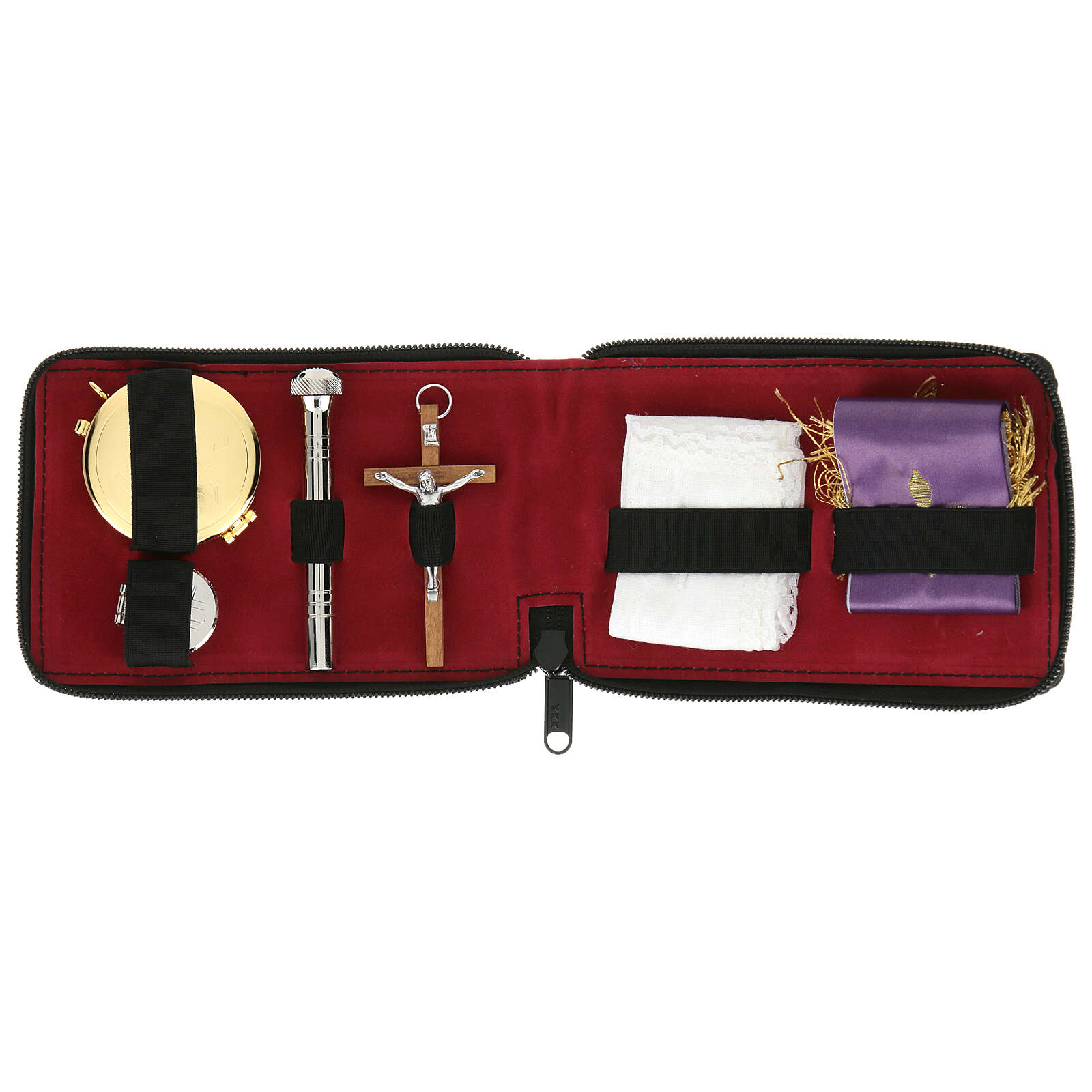 Tasche echtes Kalbleder für Sterbesakramente. Schwarz draussen, aus rotem Stoff drinnen, mit elegantem Reissverschluss.Mit 6 Stücken: kleiner Zubehörteil für Purifikation, Stola, kleines Kreuz, Asperges, Reliquiar aus goldenem Metall, Gläschen für Öle.