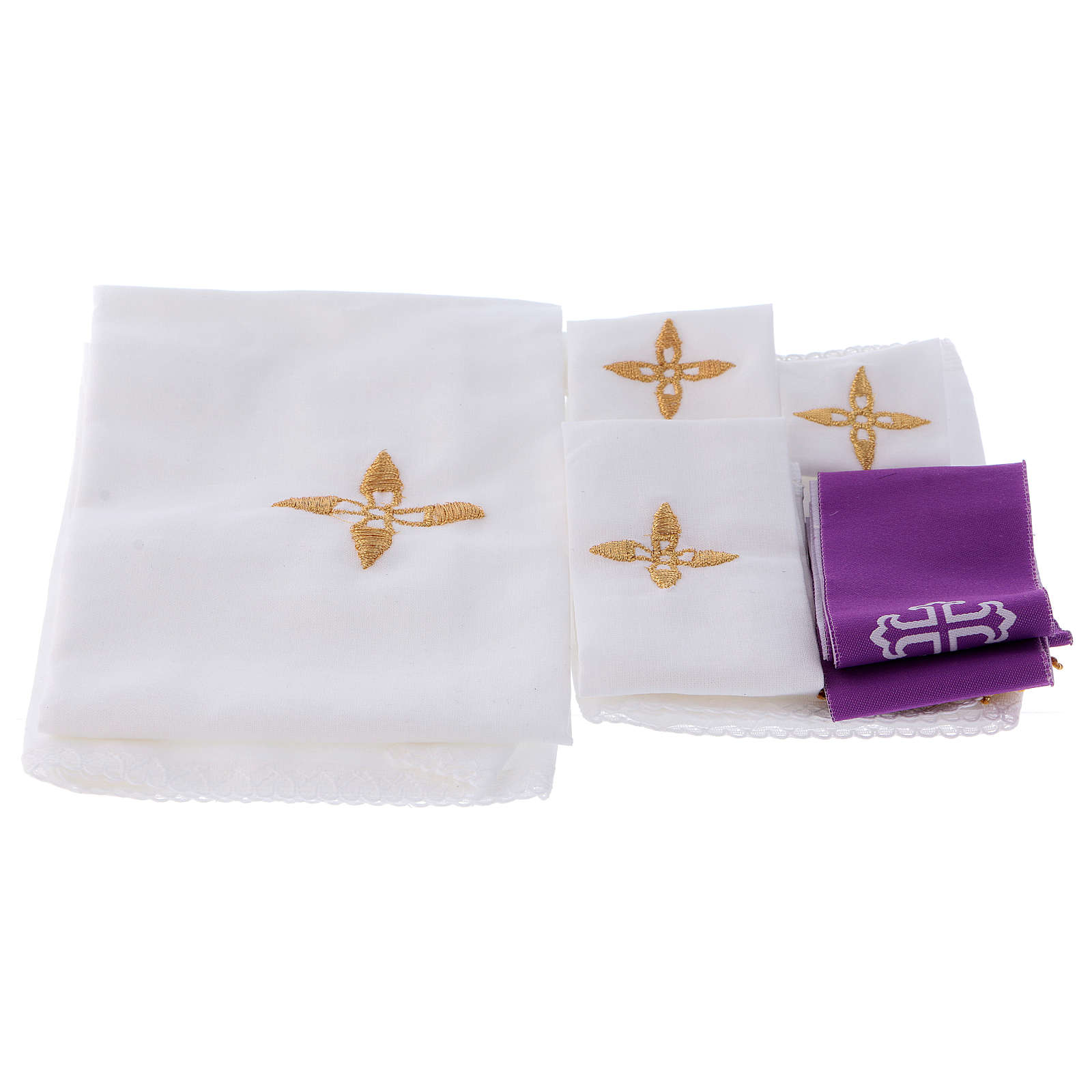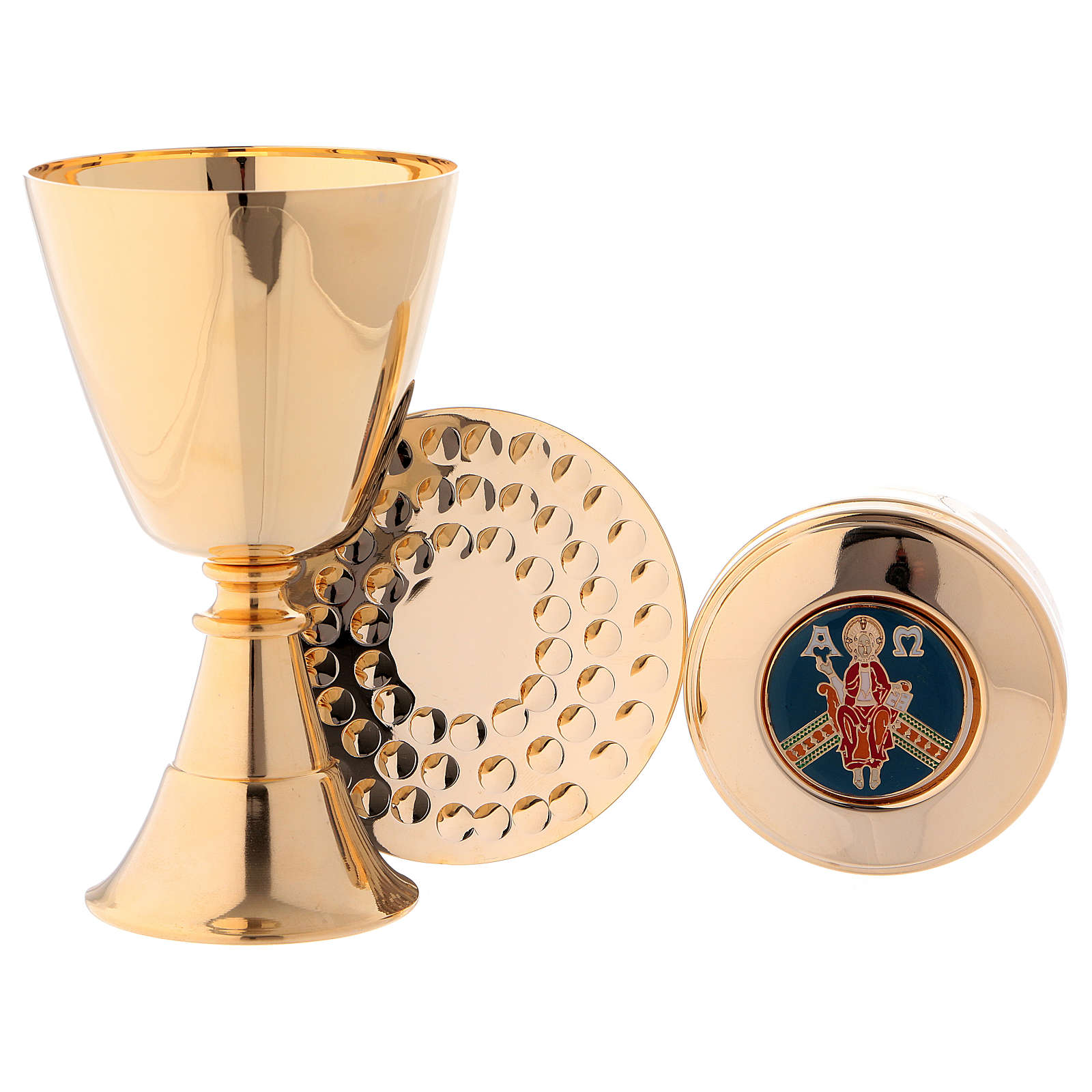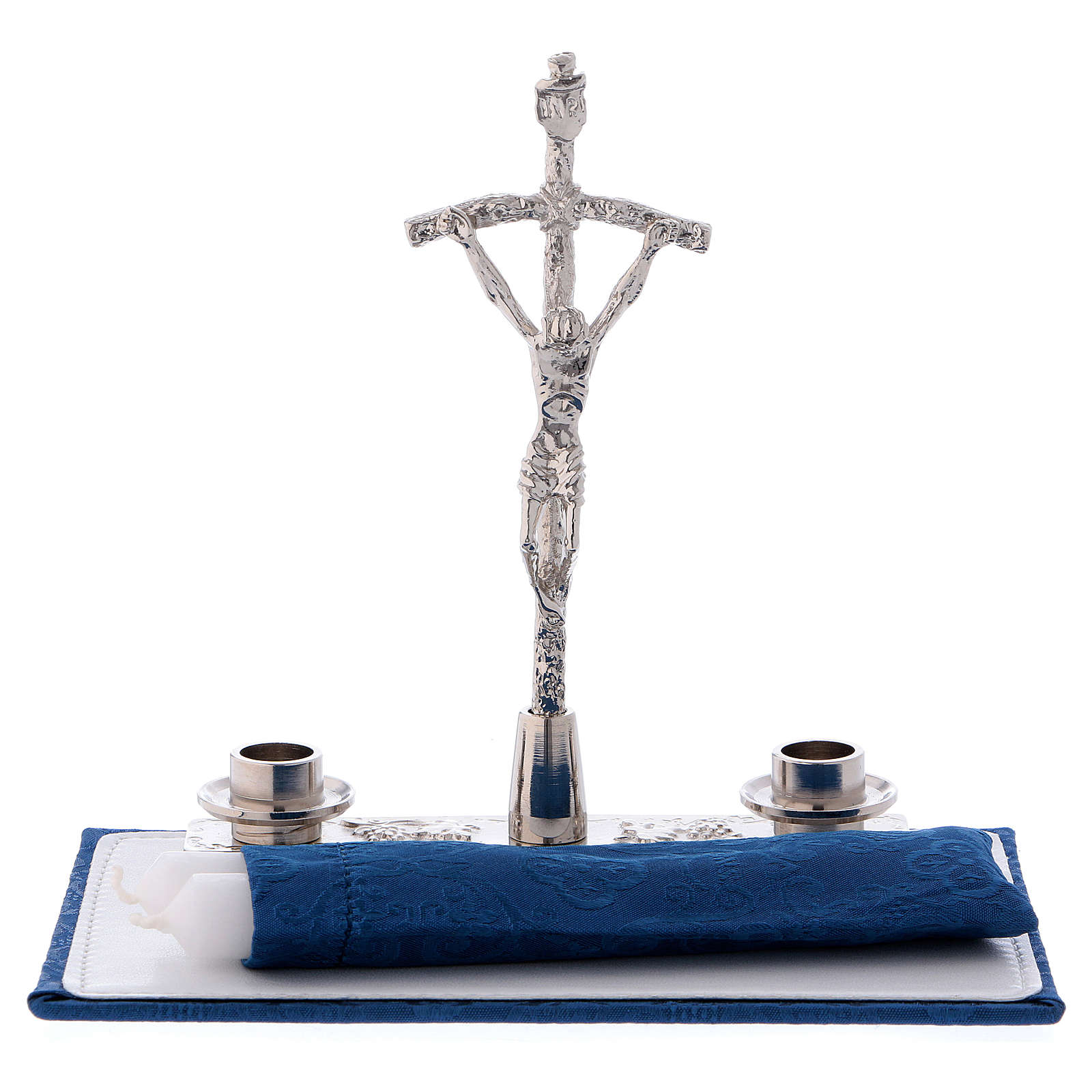 Die Tasche enthält: Kelch (15cm hoch), Kelchteller, Hostiendose, Aspergill, ein Kreuz, einen kleinen Ölgefäß, Fläschen für Wein und Wasser (125ml), einen kleinen Altar, zwei Kerzen, Kelchwäsche und eine kleine zweifarbige Stola.