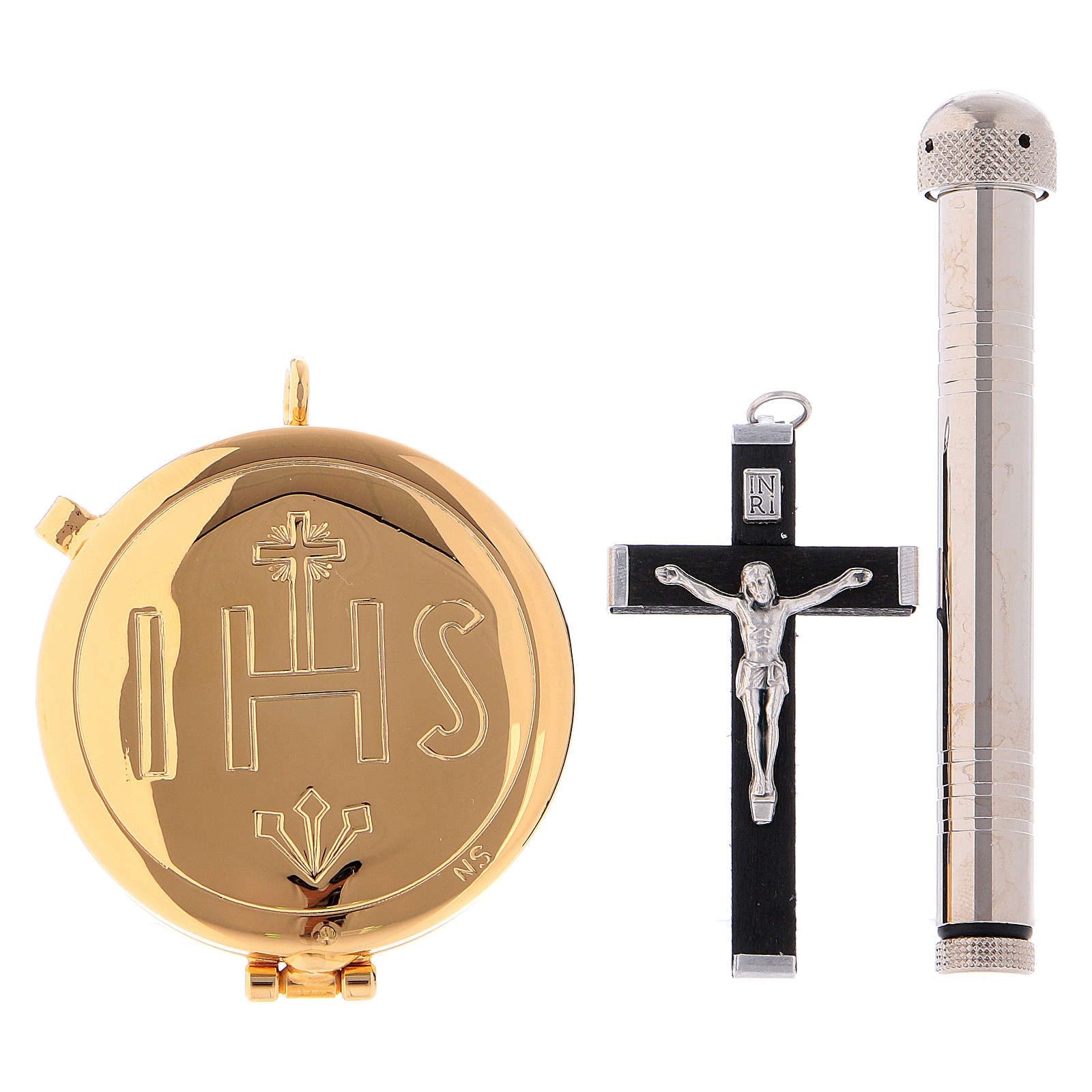Das Etui enthält: ein Holzkreuz, eine Versehpatene, ein Aspergill und eine kleine Stola.