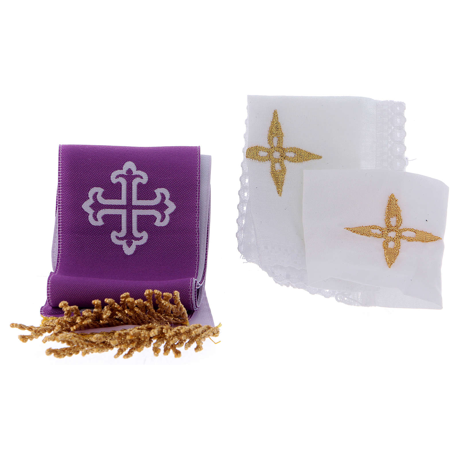 Die Tasche enthählt: eine Versehepatene aus Messing, ein Kreuz, einen Ölgefäß, einen Aspergill, eine kleine zweifarbige Stola und Kelchwäsche aus Baumwolle.