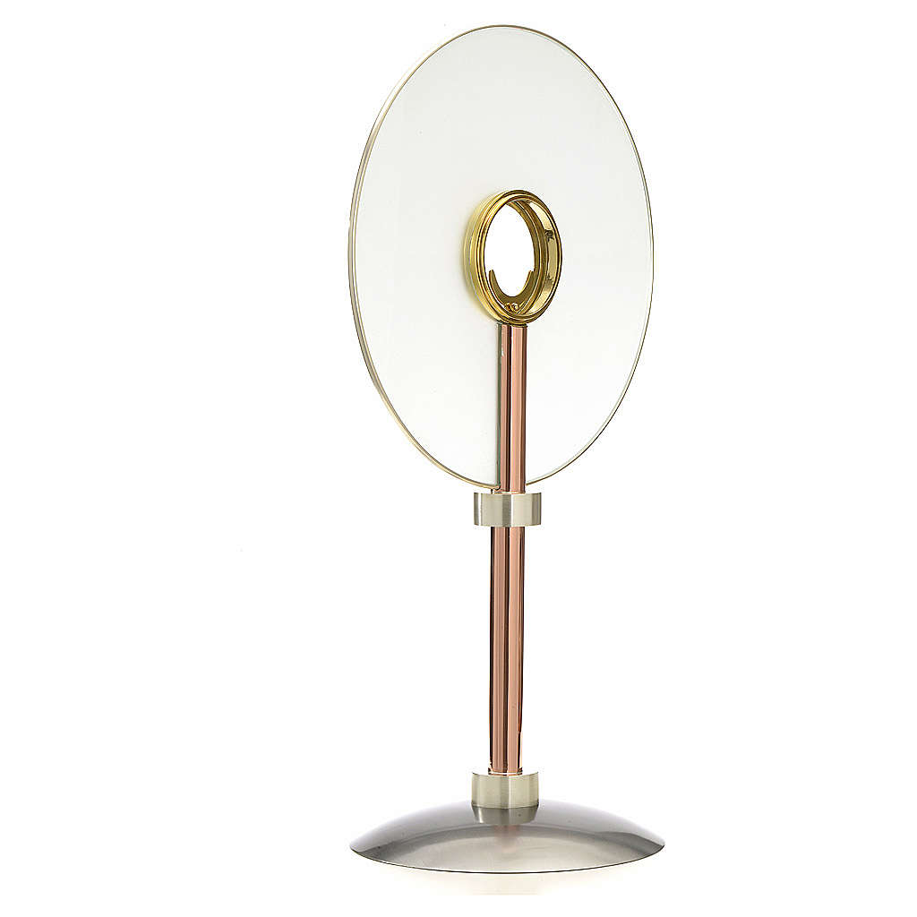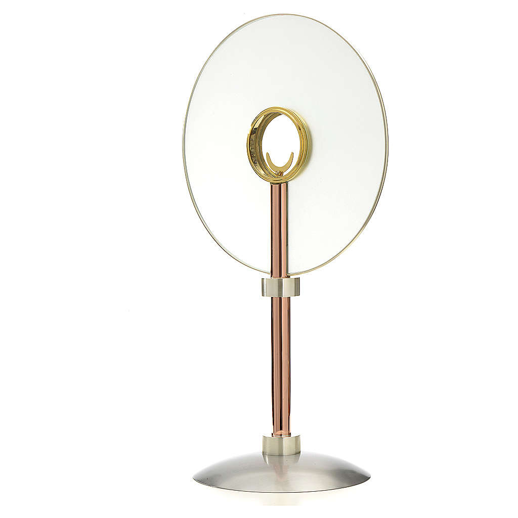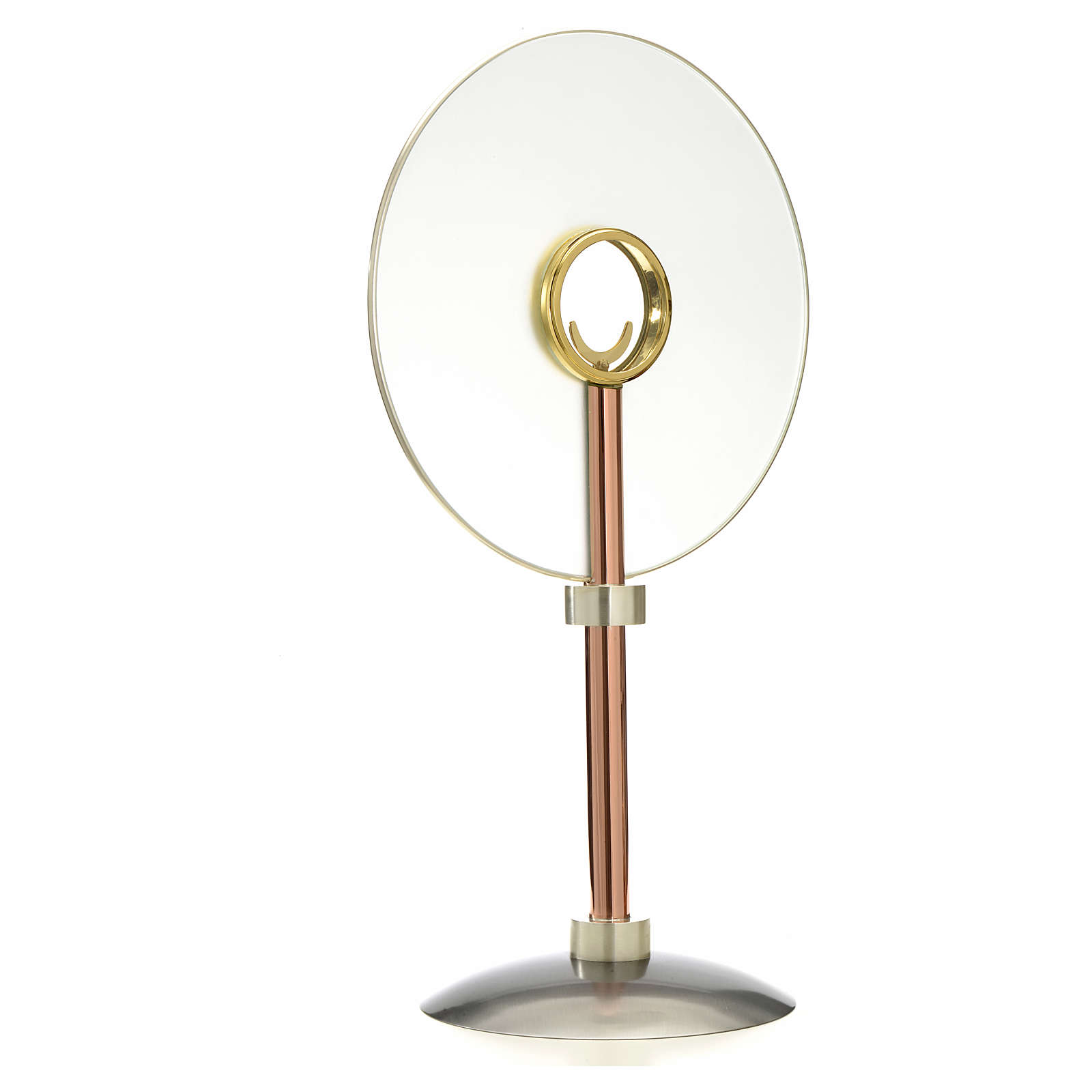 Zeitgemäße Monstranz Modell Orbis. Monstranz aus Glas, Stahl und Kupfer; Lunula aus vergoldetem Silber 925. Für Hostien von max. 7 cm Durchmesser. Moderne und köstliche Monstranz, in Italien hergestellt.