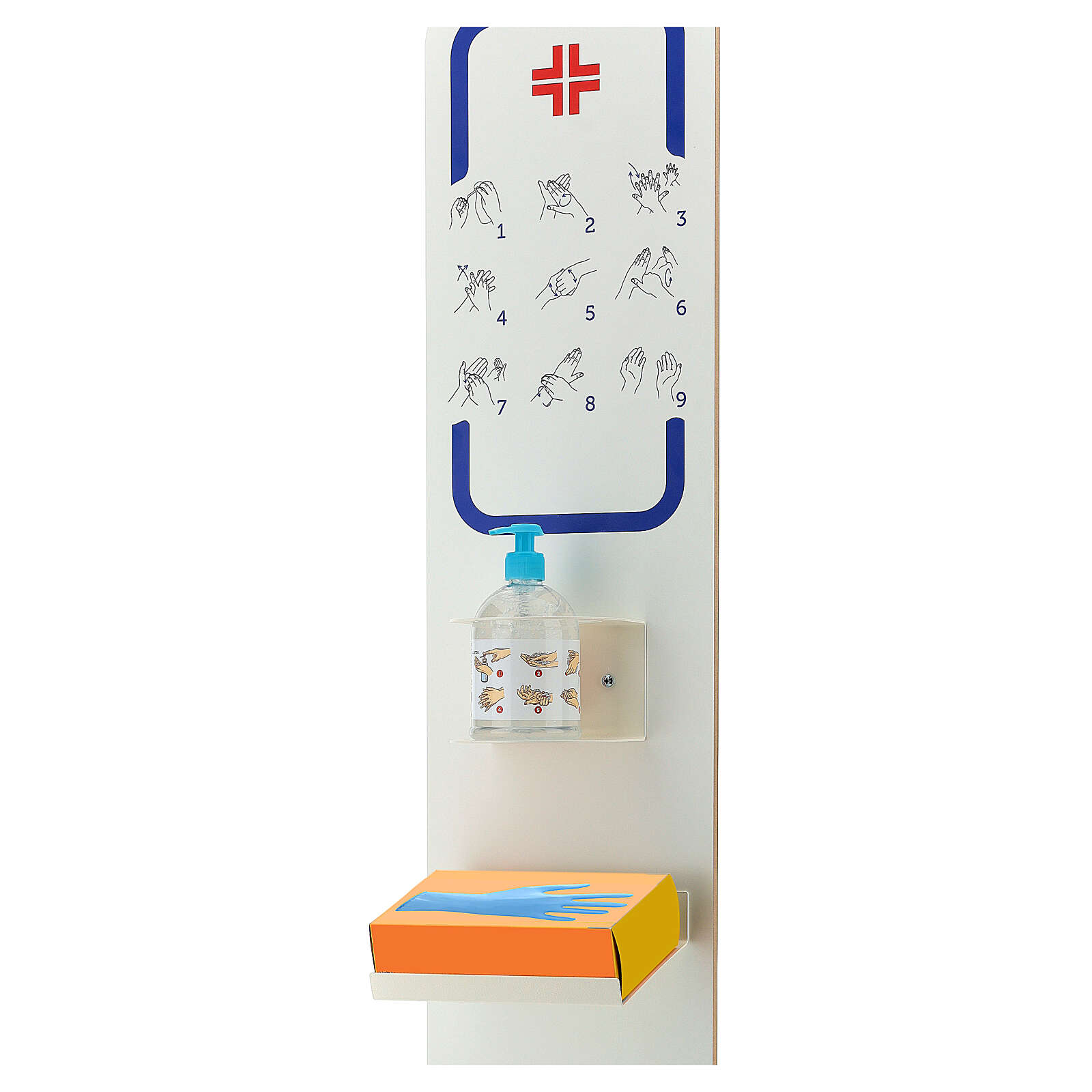 Hände-Desinfektionsmittelspender in Säulenform aus MDF und Forex.