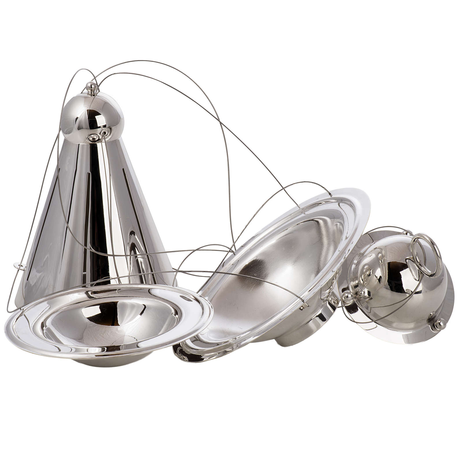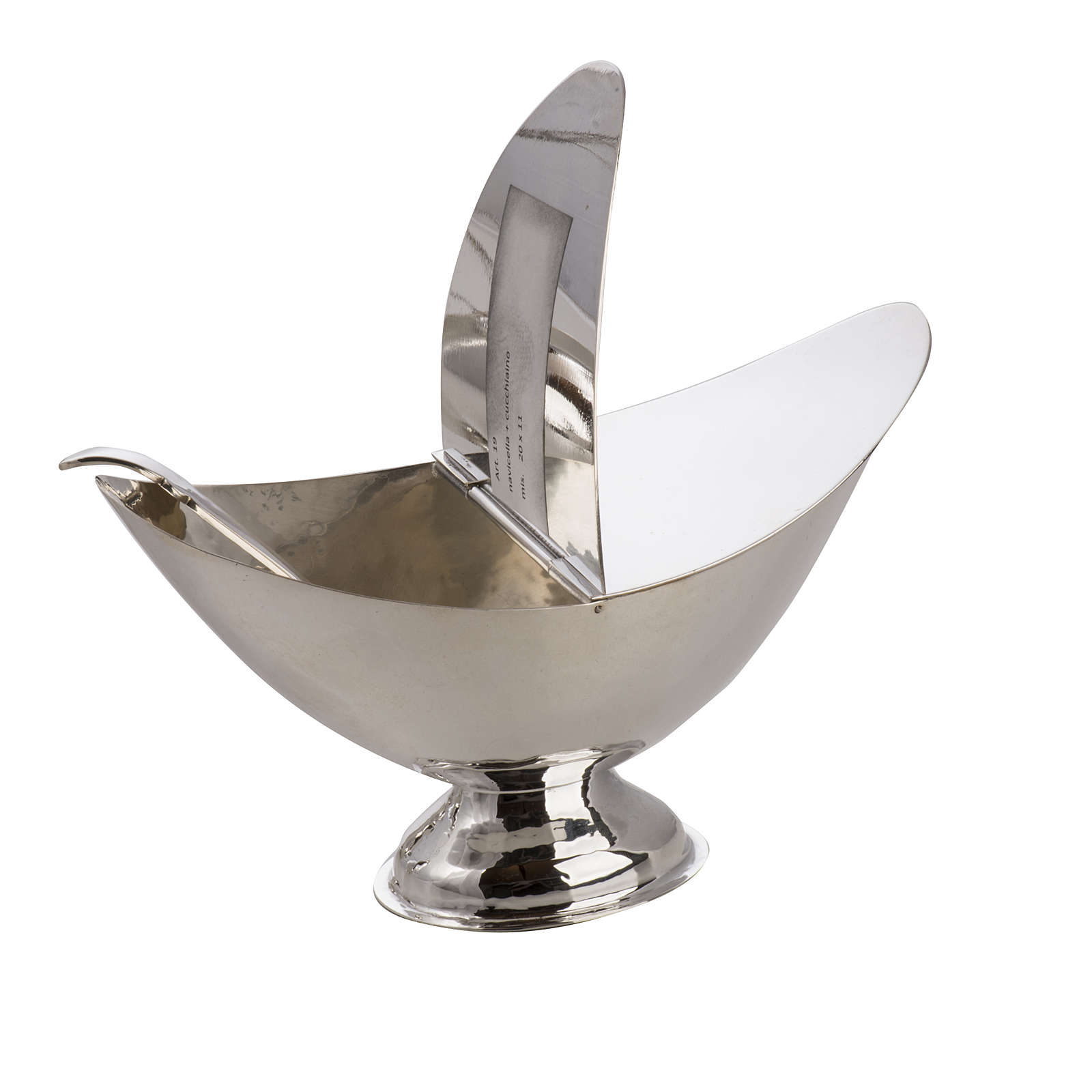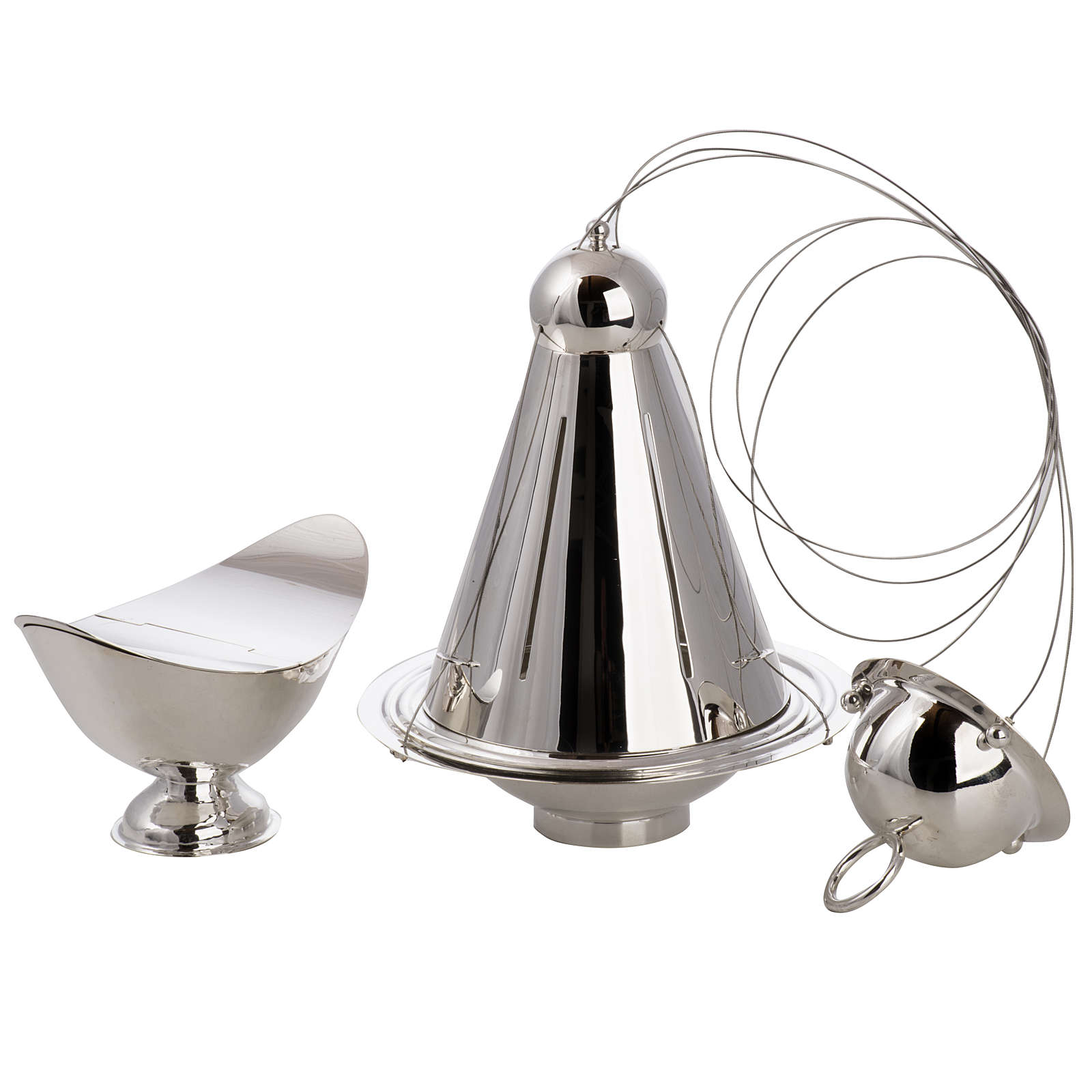 Weihrauchfass und Schiffchen versilberten Messing. Weihrauchfass und Schiffchen mit modernem Design aus versilberten Messing realisiert. Der Weihrauchfass hat Stahlseile, und das Kohlenbecken kann abgezogen werden. Das Schiffchen ist aus versilberten Messing mit Löffelchen.