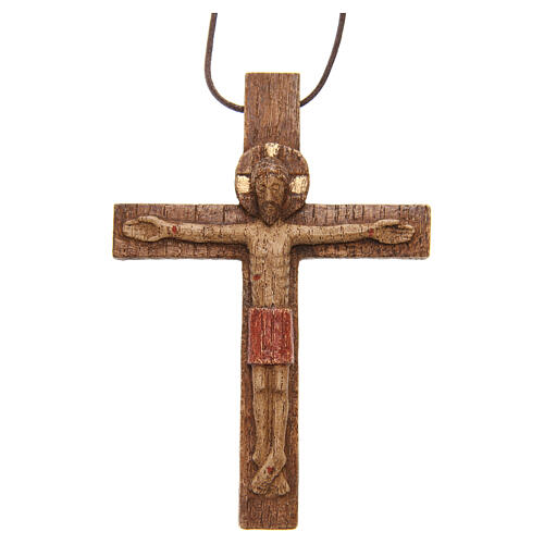 Kruzifix aus Holz dass aus dem Atelier d'Art de Bethléem kommt. Der Koerper von Jesus ist als Relief handbemalt. Es gibt auch ein Kordel um um den Hals zu ziehen. Es ist aus Holz gemeißelt, handgemacht und fein bearbeitet. Es ist handgemacht so jedes Stueck ist einzeln; auf diesem Grund kann ein Bisschen anders als im Foto sein. Es wird in Frankreich bei der Atelier d'Art de Bethléem produziert.