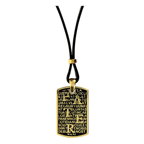 Die Halskette wird von italienischen Handwerkern mit hochwertigen Materialien hergestellt und gehört zur Precem-Kollektion von Agios. Das dunkelblaue Lederband hält den Anhänger. Die lateinische Version des Vaterunser-Gebets ziert den Anhänger, um die Sakralität der Sprache zu bewahren.