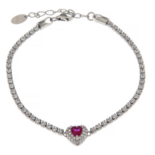 Das Armband ist aus rhodiniertem 925er Silber und weißen Zirkonen gefertigt. In der Mitte ein Herz mit rotem Zirkon.