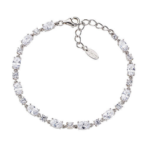 Armband von Amen aus rhodiniertem 925er Silber, besetzt mit weißen Zirkonia in abwechselnd runder und ovaler Form. Länge 16 cm, verlängerbar um 3 cm. Gewicht 6,5 g.