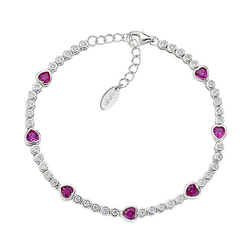 Tennisarmband aus 925er Silber mit anlaufgeschützter Rhodinierung, besetzt mit weißen Zirkonia, die durch Herz-Elemente mit rubinroten Zirkonia unterbrochen werden.