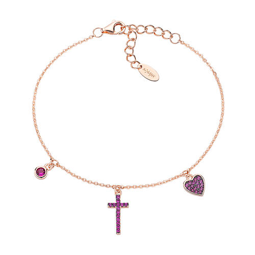 Wunderschönes Armband aus Sterlingsilber 925 mit galvanisierter Rosenverzierung. Das Schmuckstück ist mit edlen fuchsiafarbenen Zirkonkristallen verziert, die sowohl auf dem Kreuz als auch auf dem Herz und einem roten Rubin eingefasst sind.