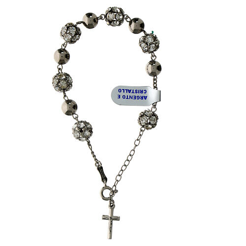 Silbernes Armband aus antikem 925er Silber mit Karabinerverschluss und hängendem Kreuzanhänger. Die Zehnerperlen bestehen aus 10 mm großen Strassbällen mit weißen Zirkonen und glatten 8 mm großen Kugeln aus antikem Silber.
