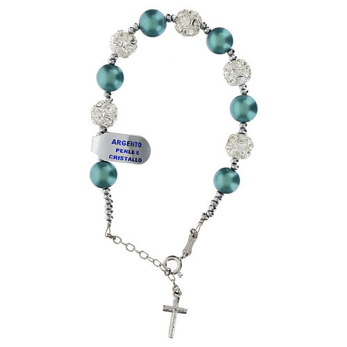 Hergestellt in Italien aus 925er Silber mit hochwertiger Rhodiumbeschichtung, die ein Anlaufen verhindert. Dieses Armband besteht aus zehn Avemaria- und Pater-Perlen aus grünen Muschelperlen und Strasskugeln mit weißen Kristallen, jeweils 10 mm im Durchmesser. Zwischen den Perlen befinden sich facettierte silberne Hämatit-Perlen.