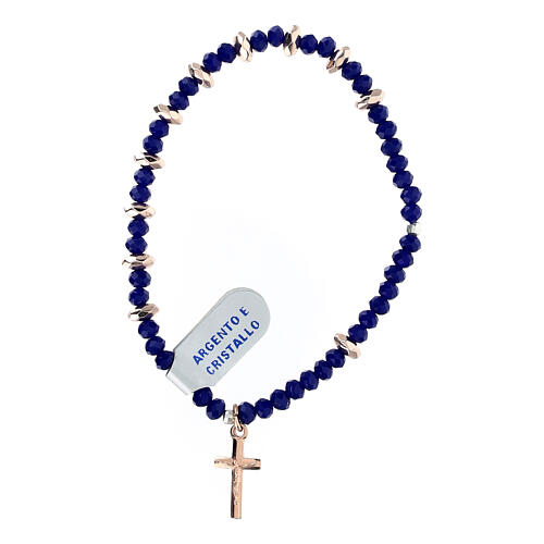 Handgefertigtes elastisches Armband mit einem Kreuzanhänger aus Silber und kleinen blauen Kristallen, durchsetzt mit roséfarbenen Hämatitperlen. Hergestellt in Italien. Umfang ca. 19 cm, mit Perlen im Maß von 3x6 mm.