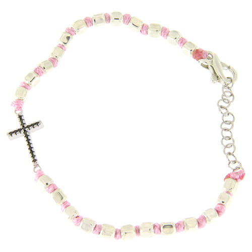 Armband Silber Perlen 2mm Kreuz mit Zirkonen. Armband realisiert aus rosa Band und Silber Perlen von 2mm und verfeinert mit einem Kreuz mit schwarzen Zirkonen.