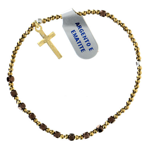 Elastisches Armband aus 2 mm mit vergoldetem Hämatit und Kreuzanhänger.