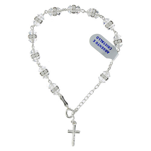 Silbernes Armband mit einem Kreuzanhänger. Die Kette ist mit einer Zehner-Gruppe verziert, bestehend aus doppeltem weißen Kristall und einem Band aus quadratischem Strass.