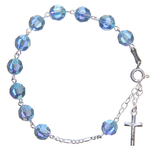 Zehner Armband Silber 800 hellblauen strass Perlen 8mm. Zehner Armband realisiert aus Silber 800 mit hellblauen strass Perlen von 8mm, und verfeinert mit einem kleinen Kreuzanhänger.