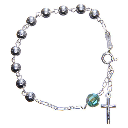 Zehner Armband Silber 800 Perlen 6mm grüne Pater Perle. Zehner Armband realisiert aus Silber 800 mit Perlen von 6mm und mit grünen strass Pater Perle. Der Armband ist verfeinert mit einem kleinen Kreuzanhänger. Kreisumfang: 20.5cm.