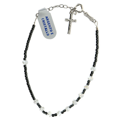 Dieses Zehnerarmband verfügt über 4 mm große Perlen aus weißem Kristall, die von zylindrischen Hämatitscheiben und einem 1,5x1 cm großen Kreuzanhänger aus rhodiniertem 925er Silber geziert werden. Der Umfang des Armbands beträgt maximal 22 cm und ist dank des praktischen Verschlussmechanismus aus rhodiniertem 925er Silber, demselben Material wie die Kette, verstellbar. Ein fein und elegant aussehendes Armband, hergestellt von erfahrenen italienischen Kunsthandwerkern.