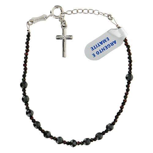 Dieses Armband mit zehn Dekaden aus 925er Silber wurde von italienischen Handwerkern gefertigt. Es verfügt über einen funktionalen Hakenverschluss, der es ermöglicht, das Armband in verschiedenen Größen anzupassen (maximale Größe 22 cm). Das Schmuckstück zeichnet sich durch zehn facettierte 4 mm schwarzen Hämatitperlen und viele kleine glänzende facettierte Kugeln aus dem gleichen Material aus. Ein Anhänger in Form eines 1,5x1 cm großen Kreuzes aus 925er Silber ist ebenfalls zu erkennen.