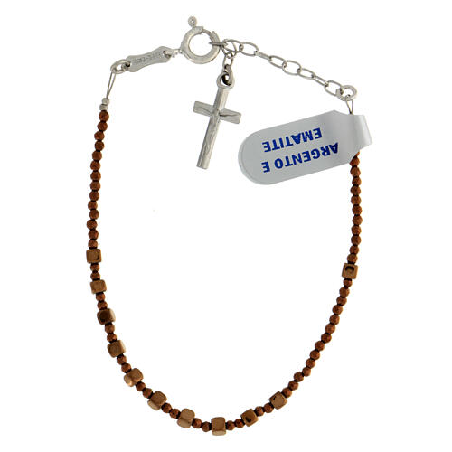 Dieses Zehnerarmband aus 925er Silber wurde von erfahrenen italienischen Handwerkern gefertigt. Es besteht aus kubischen 2 mm großen Bronzehämatitperlen und anderen kleinen facettierten Perlen, die ebenfalls aus bronzierter Hämatit sind. Ein Anhängerkreuz mit den Maßen 1,5x1 cm aus 925er Silber ist vorhanden. Der praktische Verschluss des Armbands besteht aus 925er Silber und ermöglicht eine individuelle Anpassung der Größe (maximale Umfang 22 cm).