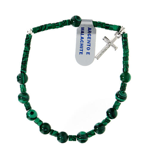 Elastisches Zehnerarmband mit 6 mm Malachit-Perlen und einem Anhänger in Form eines 1,5x1 cm großen Kreuzes aus rhodiniertem 925er Silber. Zwischen den Perlen befinden sich ebenfalls zylindrische Malachit-Scheiben. Handgefertigt von italienischen Handwerkern, hat das Armband einen Umfang von 18 cm.